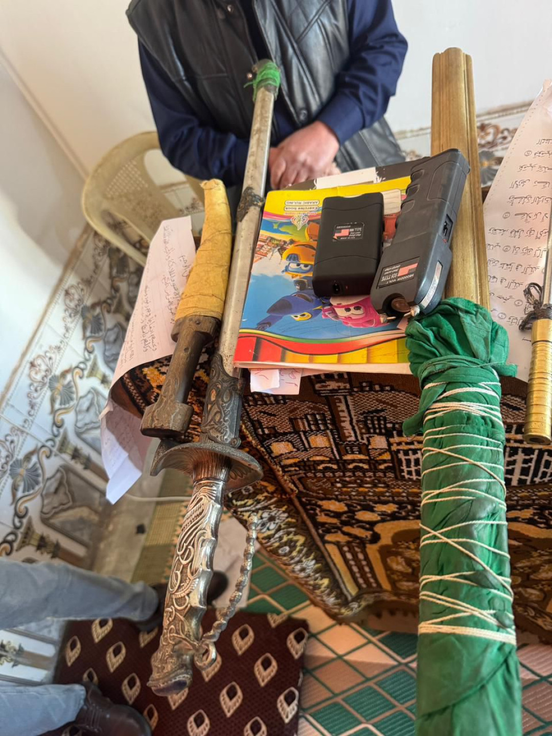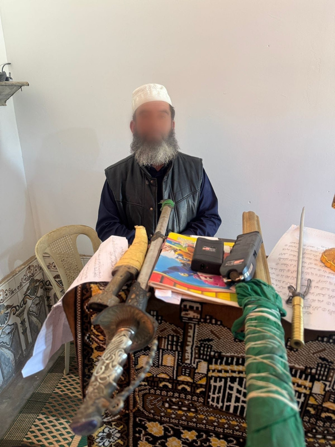 وأضافت أنه "ضُبط داخل دار المتهم على مجموعة خرز وكتب للسحر ومن ضمنها كتاب (شمس الشموس) وسيوف وخناجر ومجموعة أوراق تحتوي على كتابات وطلاسم مختلفه مع وجود أوراق تحتوي على أسماء ذكور وإناث".