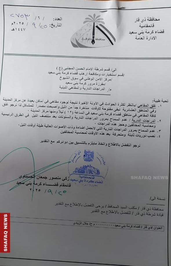 وقال قائممقام القضاء، زكي منصور، في كتاب رسمي موجه إلى الأجهزة الأمنية والدوائر المعنية، حصلت عليه وكالة شفق نيوز، إنه "بالنظر لكثرة الحوادث في الآونة الأخيرة نتيجة لوجود مقاهي في أماكن بعيدة عن مركز المدينة وفي المناطق العشائرية، وتبقى مفتوحة لأوقات متأخرة جداً من الليل ولتسببها بحوادث السير، عليه تقرر كافة المقاهي في مناطق قضاء كرمة بني سعيد في الساعة الـ12 منتصف الليل".