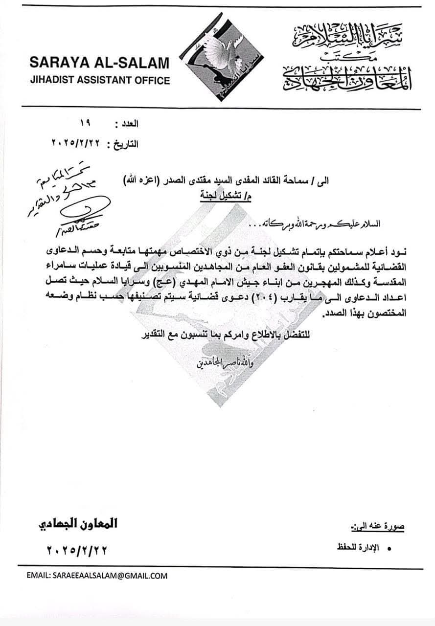 وثيقة موجهة لزعيم التيار الصدري، مقتدى الصدر، وردت لوكالة شفق نيوز، فإن سرايا