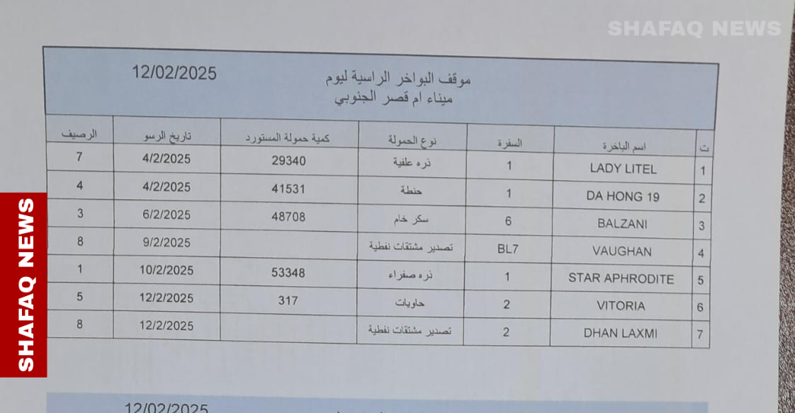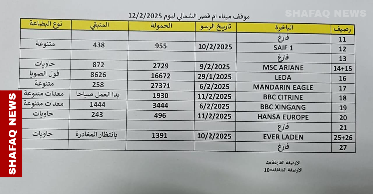 وبحسب وثائق رسمية وصلت لوكالة شفق نيوز، فإن "موقف السفن الراسية في ميناء أم قصر الشمالي اليوم، بلغت 8 سفن شغلت 10 أرصفة، محملة بمختلف المواد الغذائية و الانشائية".