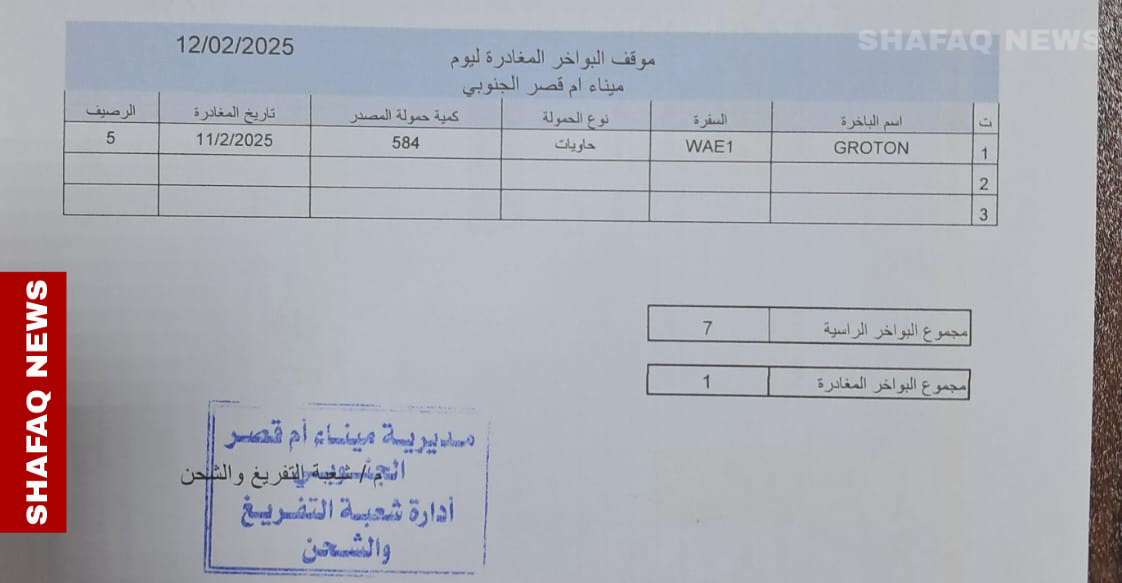 وأظهرت الوثائق أيضاً، أن "البواخر الراسية في ميناء أم قصر الجنوبي اليوم، بلغت 7 بواخر والمغادرة باخرة واحدة، محملة بمختلف المواد الغذائية و النفطية".