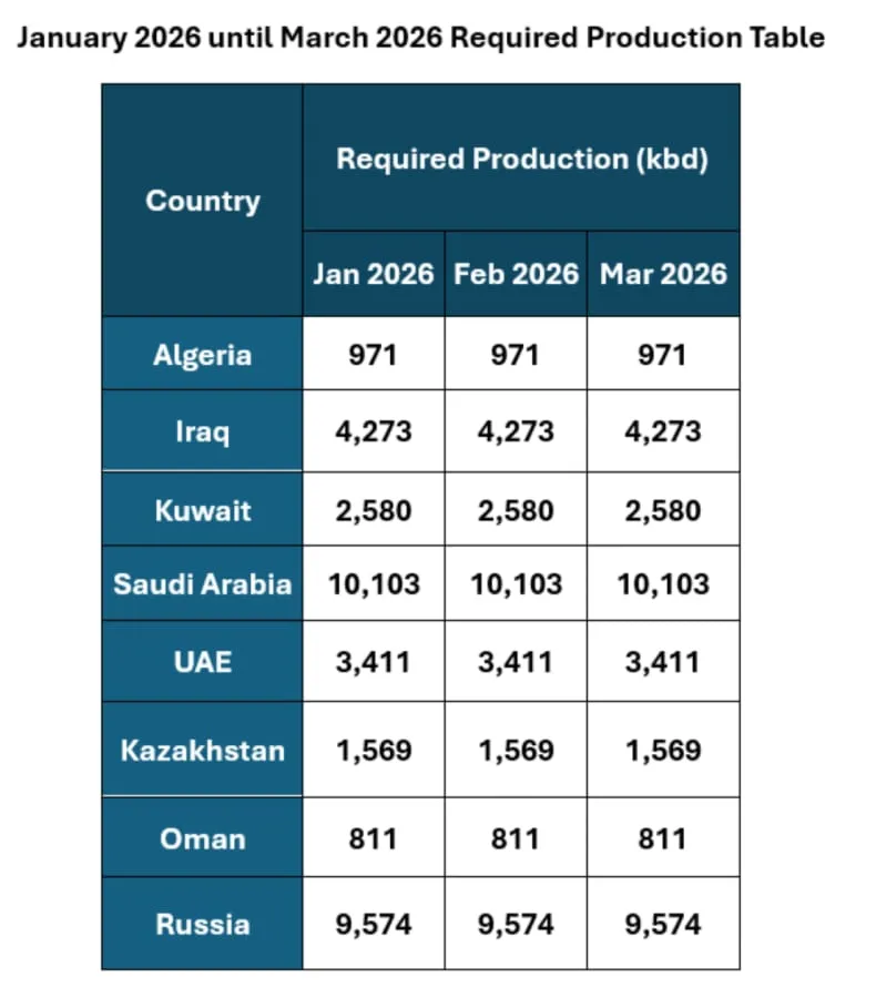 وجددت الدول الثمانية التزامها بالقرار الصادر في 2 نوفمبر 2025، القاضي بتعليق الزيادات الإنتاجية خلال أشهر يناير وفبراير ومارس 2026، مراعاة للعوامل الموسمية، وذلك وفق التفاصيل الواردة في الجدول المعتمد.