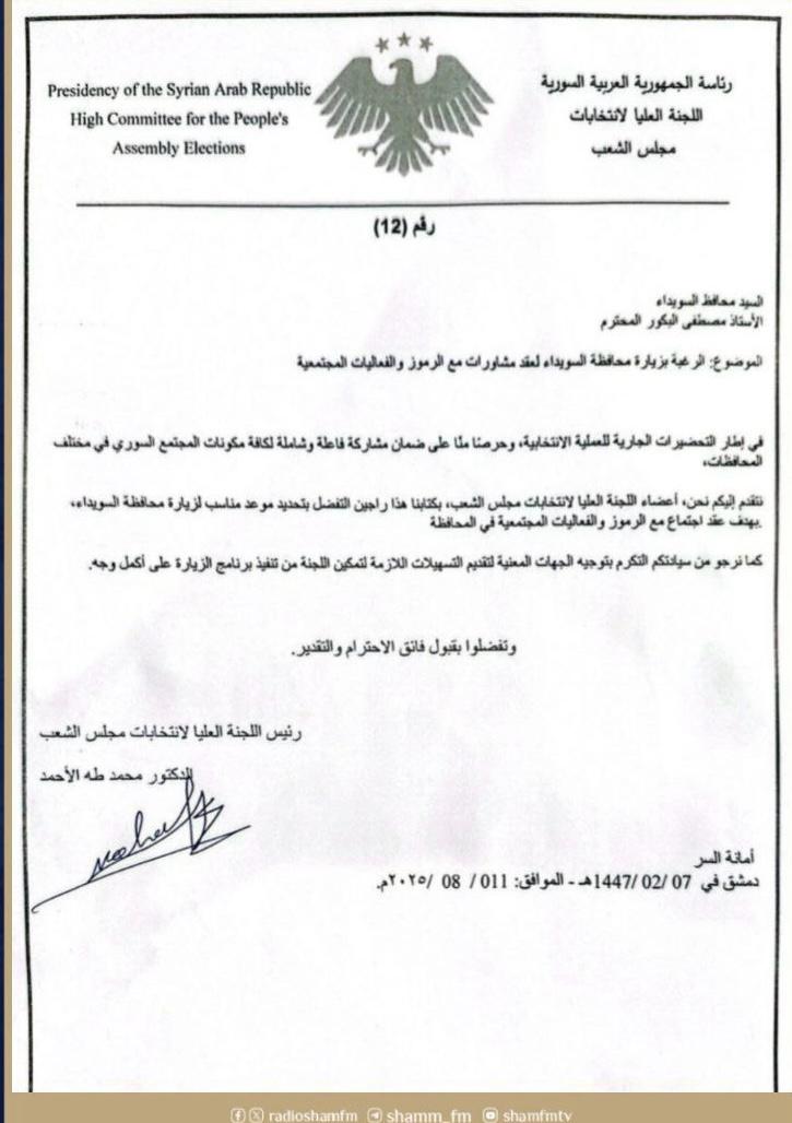 خاص.. لجنة انتخابات البرلمان السوري توجه طلباً يخص رموز السويداء (وثيقة)