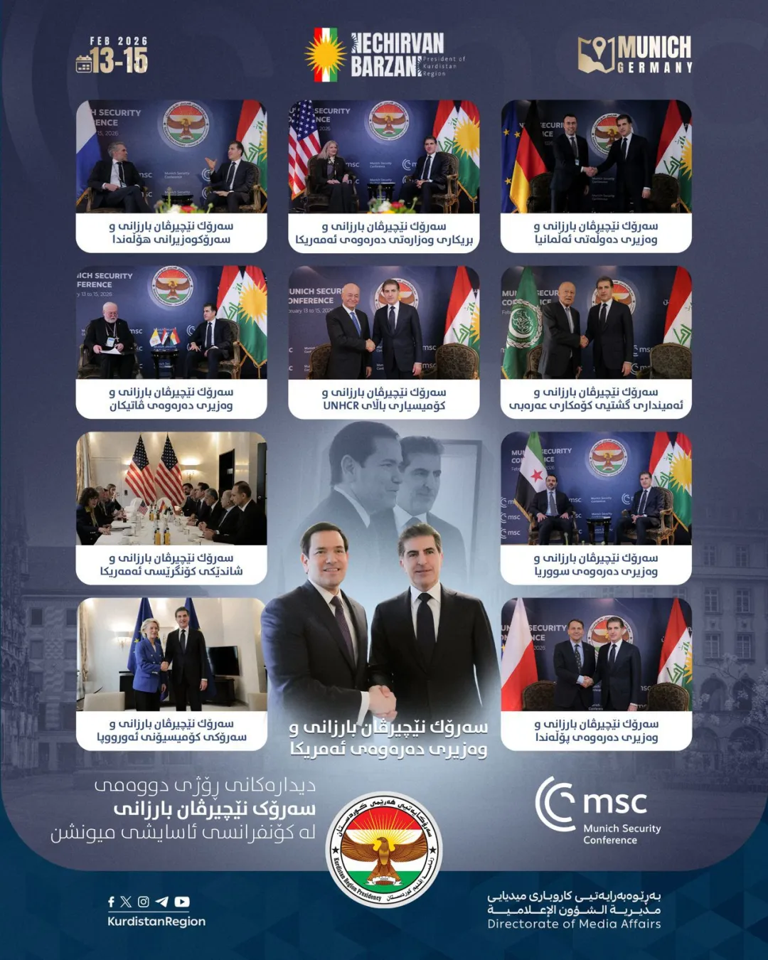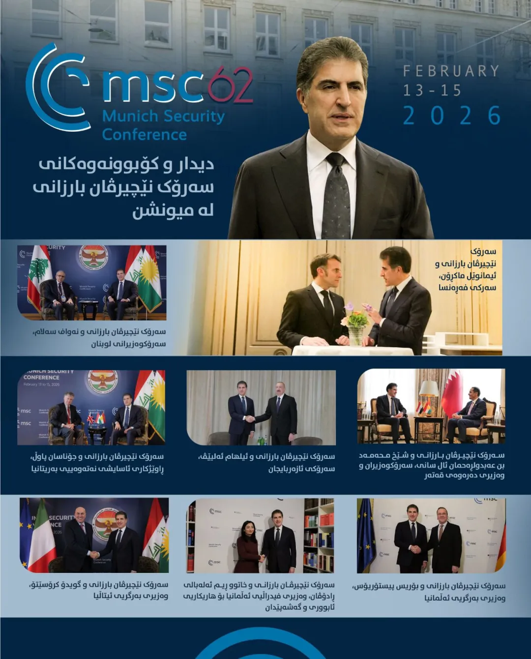 في فندقي بايريشرهوف وروزوود خلال مؤتمر ميونخ للأمن 2026 الذي انعقد بين 13 و15 فبراير شباط، تحرّك نيجيرفان بارزاني بين قاعات مغلقة ولقاءات سريعة، متنقلاً بين ضجيج الممرات في مقر المؤتمر التقليدي ومساحات الاجتماع الأكثر خصوصية في الفندق الثاني، في لحظة كانت أوروبا فيها تتجادل حول معنى التحالف عبر الأطلسي ومعنى الحرب في أوكرانيا ومعنى أن تتبدّل قواعد اللعبة فجأة.