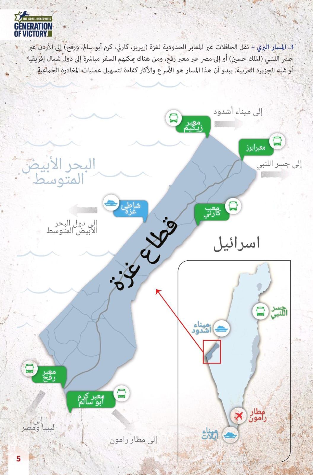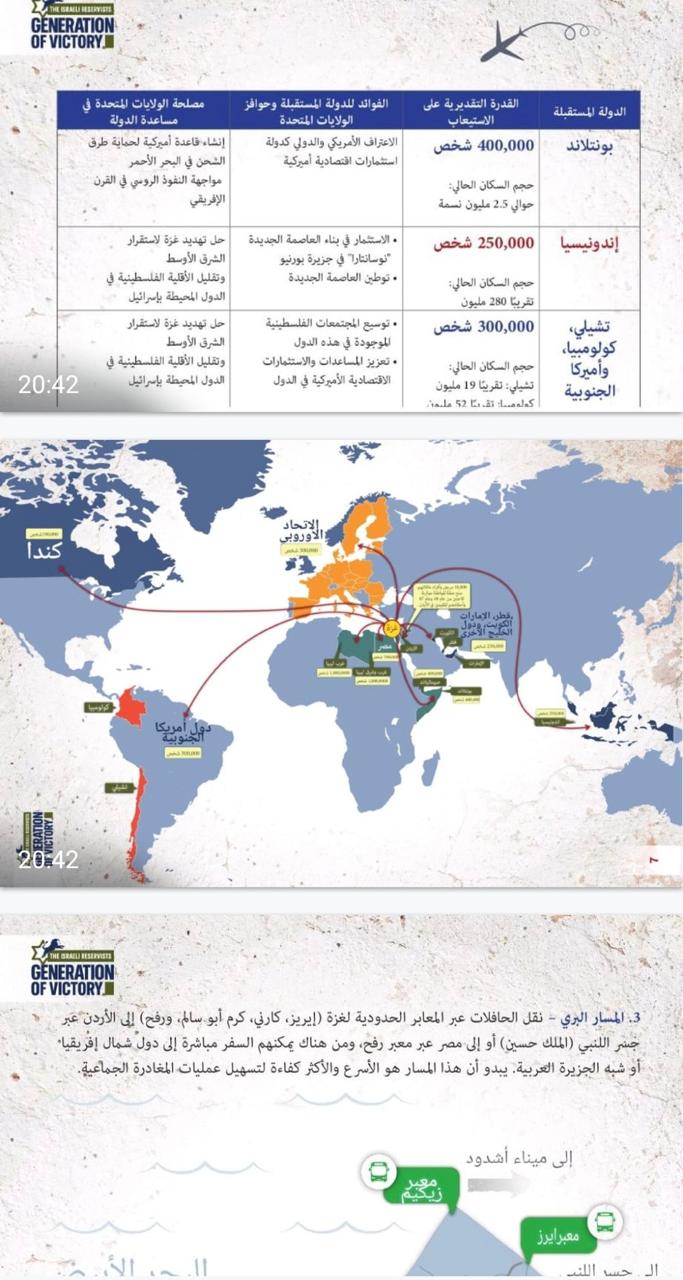 ووفقا لمجموعة خرائط واحصائيات نشرها موقع the israel generation of victory gaza وتابعتها وكالة شفق نيوز، فإن "الخطة تتضمن الخروج الطوعي لأهالي غزة من القطاع وهو مشروع من شأنه ان يحول المنطقة من حالة الفوضى والارهاب الى الاستقرار الدولي"، على حد وصفه.