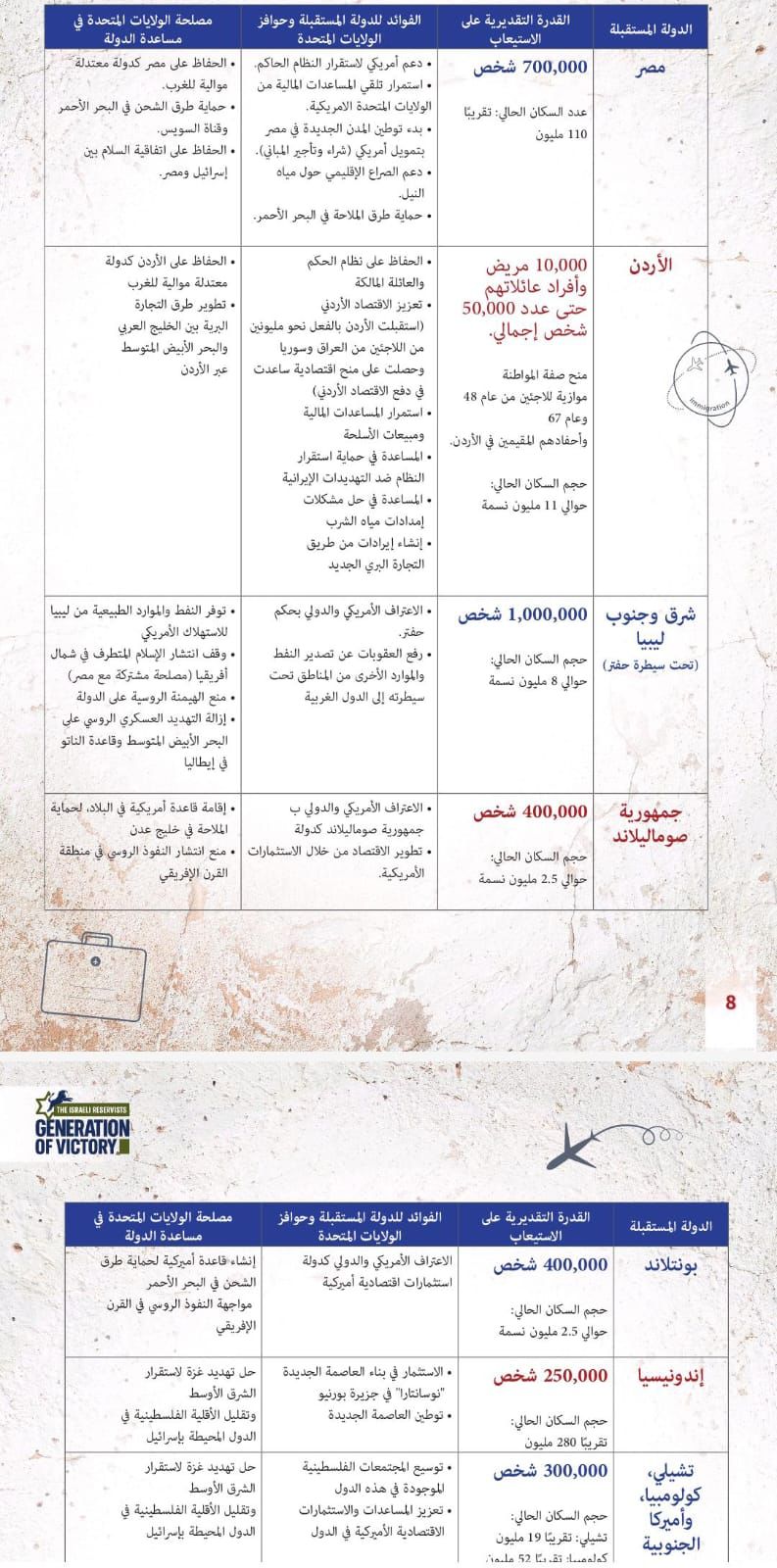 الموقع اشار الى ان "ليبيا ستستقبل مليون فلسطيني مقابل الاعتراف بحكم الجنرال خليفة حفتر ورفع العقوبات عنها ومنع الهيمنة الروسية على البلد"، موضحا ان "الصومال ستستقبل 400 الف فلسطيني مقابل الاعتراف بها دولة واقامة قاعدة امريكية فيها لحماية الملاحة الدولية، اضافة الى 400 الف فلسطيني في بوتلاند، و250 ألف شخص في إندونيسيا".