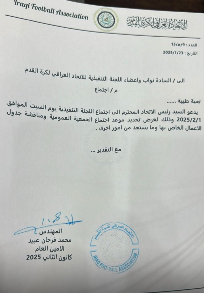 رئيس الاتحاد العراقي لكرة القدم عدنان درجات نوابه وأعضاء الاتحاد إلى اجتماع