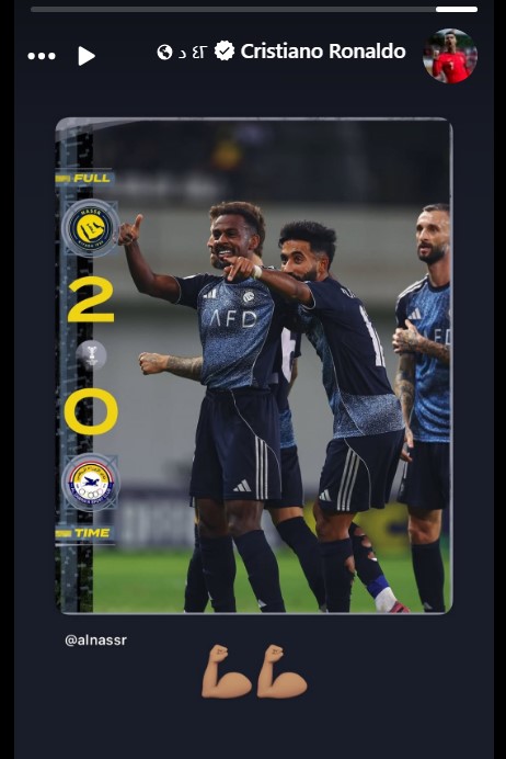 ونشر النجم البرتغالي كريستيانو رونالدو عقب انتهاء المباراة - والتي غاب عنها - منشوراً عبر خاصية "الستوري" تتضمن نتيجة المباراة مرفقة بإيموجي "عضلة الذراع" في أسفلها، دون أن يضيف في المنشور أي نص.