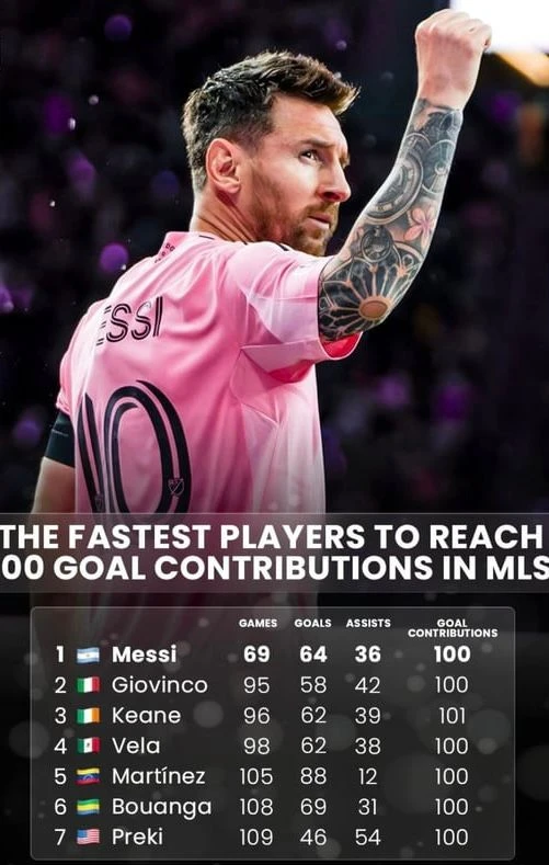 وبهذا الأداء، أصبح ميسي أسرع لاعب يصل إلى 100 مساهمة تهديفية في تاريخ الدوري الأميركي لكرة القدم خلال 69 مباراة فقط، وتشمل هذه المساهمات الأهداف والتمريرات الحاسمة.