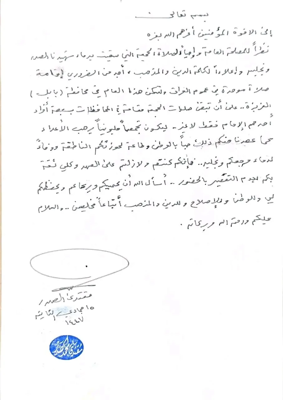 الصدر يدعو لإقامة صلاة جمعة موحدة في بابل "ليكون تجمعاً مليونياً يرهب الأعداء"