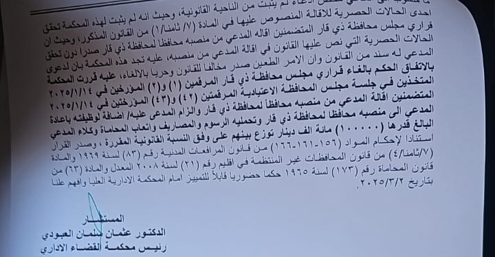 القضاء يلغي قرار إقالة محافظ ذي قار ويأمر بإعادته إلى منصبه.. وثيقة