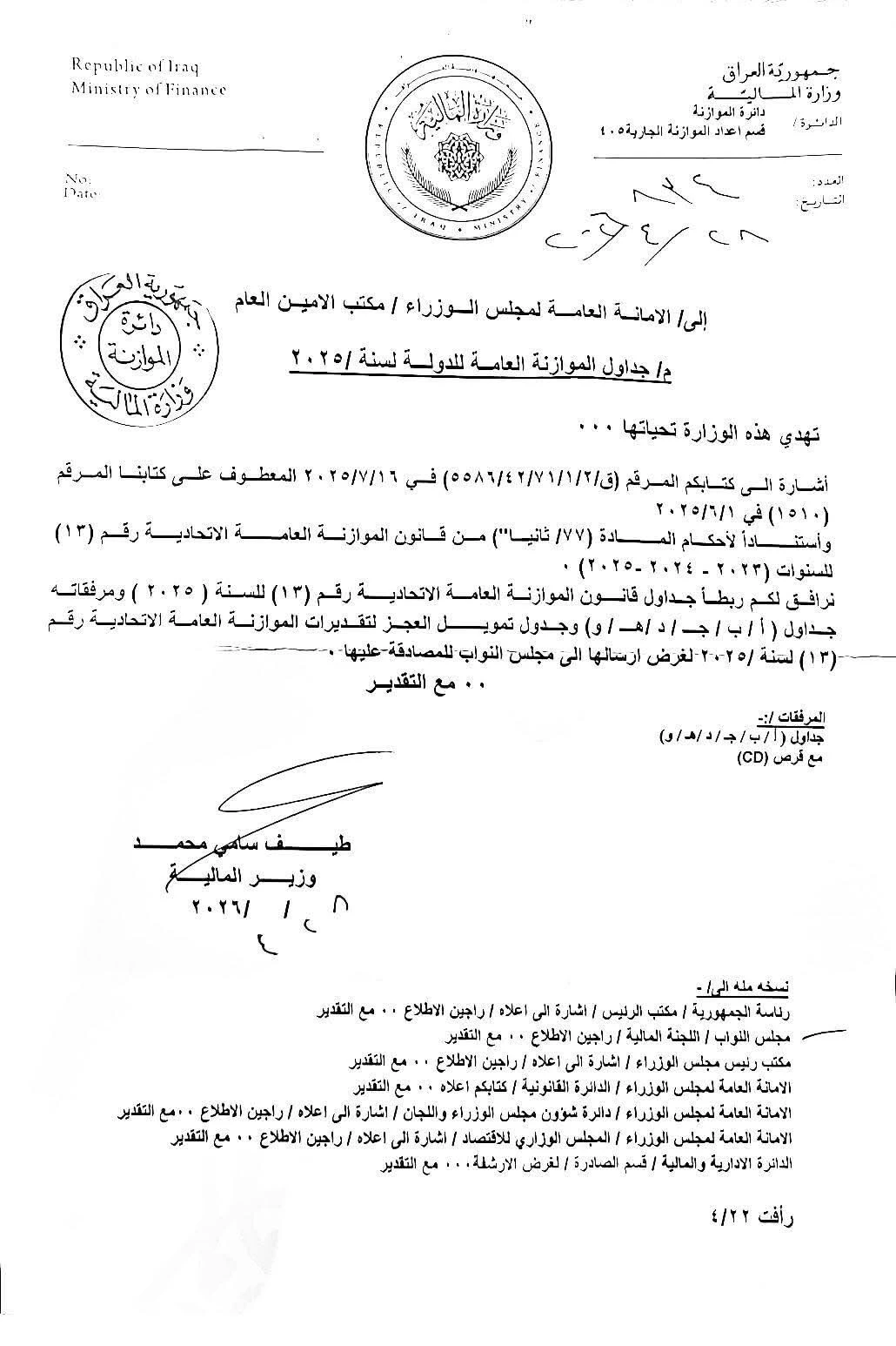 وتنشر وكالة شفق نيوز الوثيقة الصادرة عن وزارة المالية/ دائرة الموازنة بتاريخ 28 نيسان 2026، والموقعة من قبل الوزيرة طيف سامي، والتي تُظهر إحالة جداول الموازنة العامة لسنة 2025 وجدول تمويل العجز إلى الأمانة العامة لمجلس الوزراء لغرض إرسالها إلى مجلس النواب للمصادقة عليها.