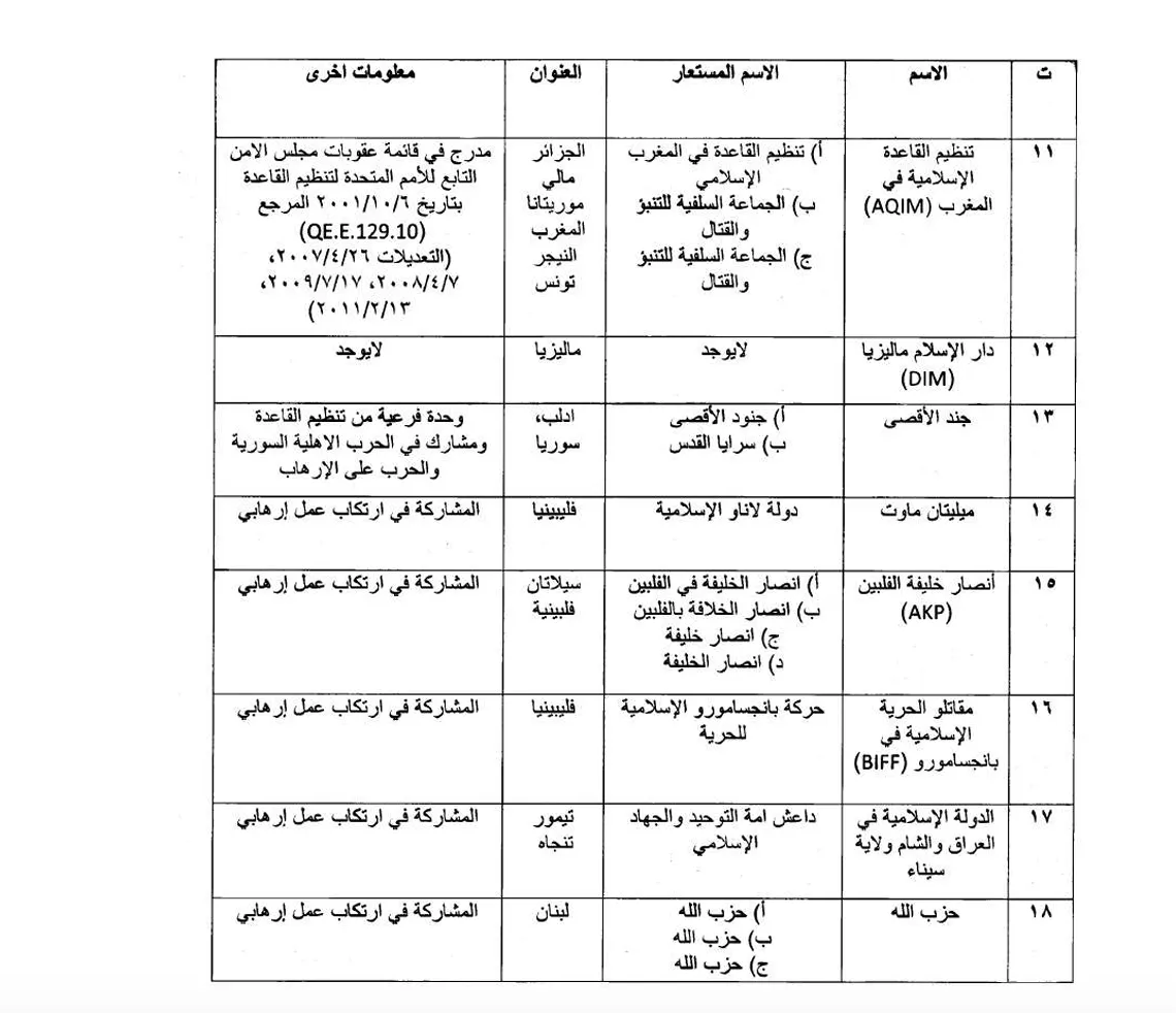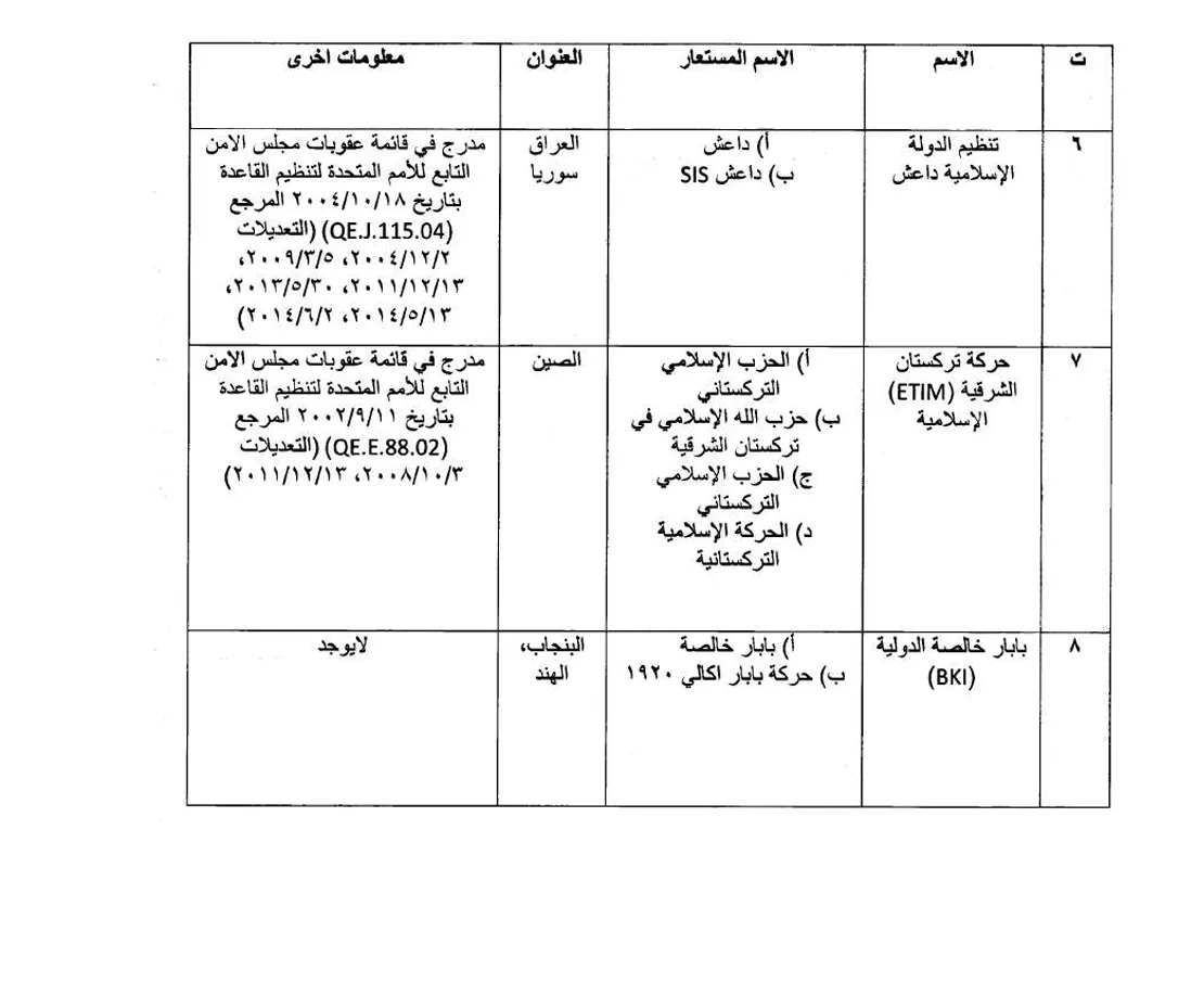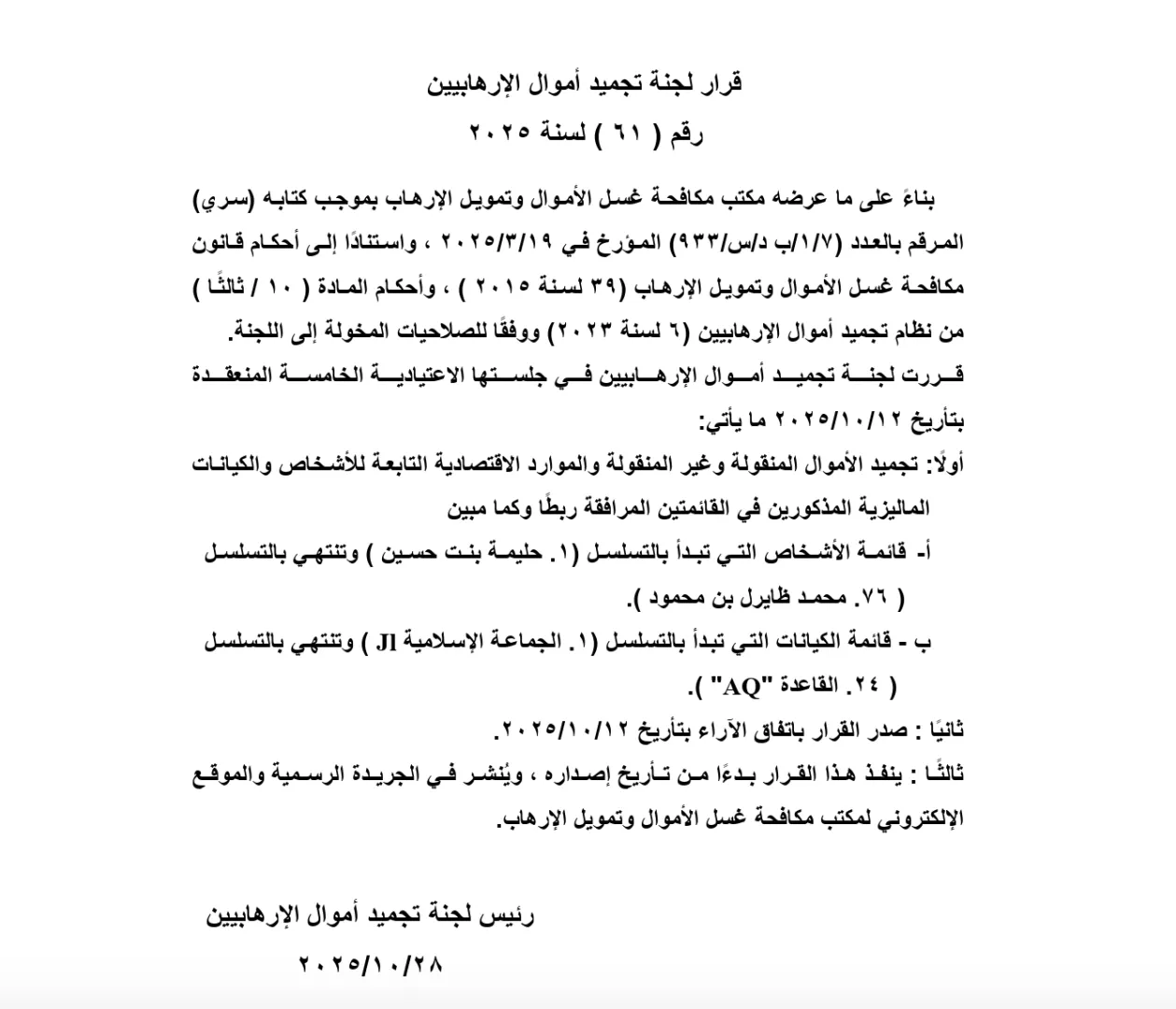 وتستند قرارات اللجنة إلى قانون مكافحة غسل الأموال وتمويل الإرهاب رقم 39 لسنة 2015، ونظام تجميد أموال الإرهابيين رقم 6 لسنة 2023، فضلاً عن القرارات الأممية المتعلقة بتنظيم داعش والقاعدة والكيانات والأفراد المرتبطين بهما، إلى جانب أنظمة عقوبات أخرى ذات صلة، والتي تُلزم الدول الأعضاء بتجميد أموال الأشخاص والجهات المدرجين على لوائح العقوبات الدولية