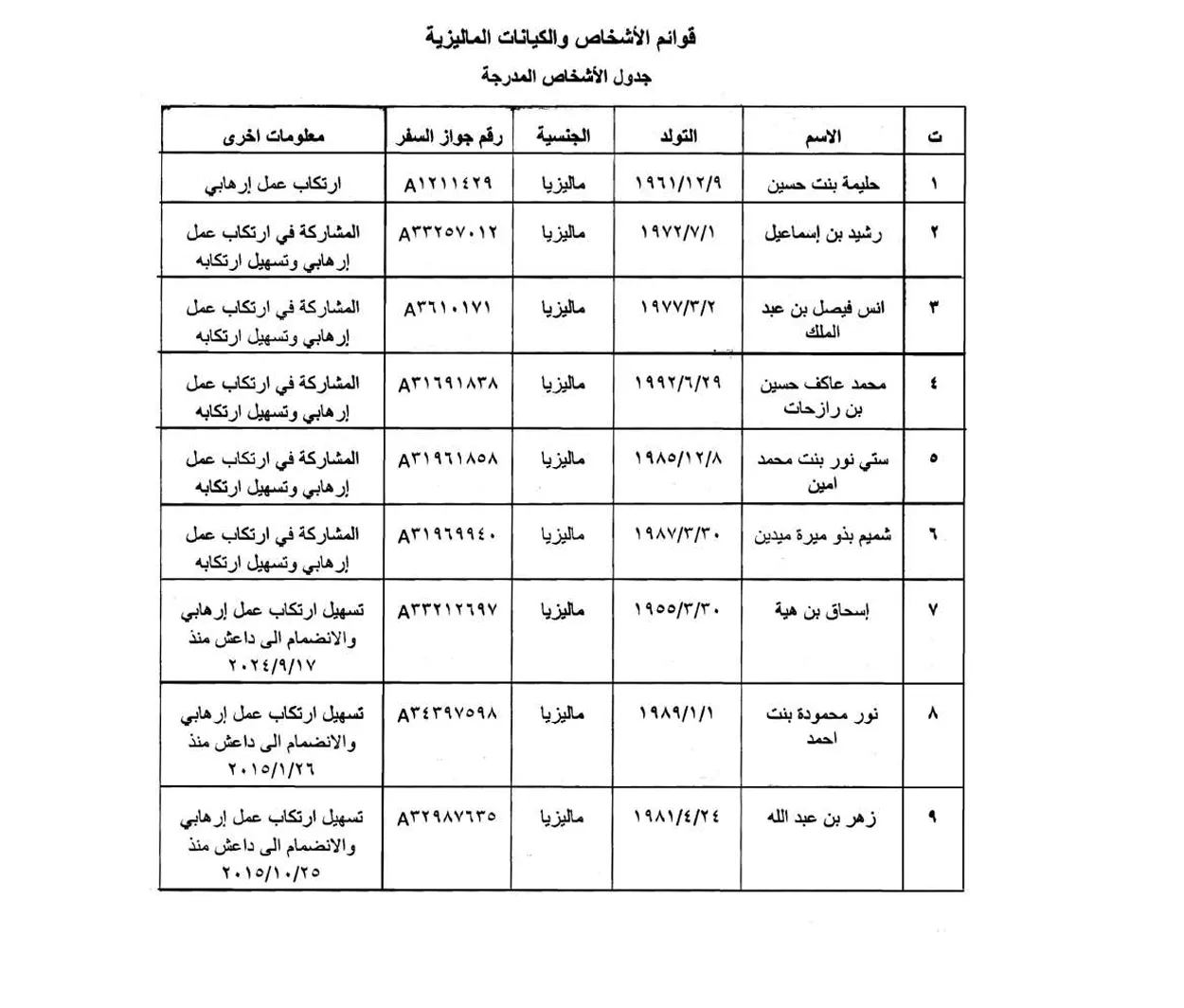 وبموجب القرار، تُلزم جميع المصارف والمؤسسات المالية والجهات المعنية في العراق بتجميد الأموال المنقولة وغير المنقولة العائدة للأسماء المشمولة، ومنع التعامل المالي أو المصرفي معهم بشكل مباشر أو غير مباشر، إلى حين صدور قرارات أخرى تقتضي رفع التجميد أو تعديله، مع نشر التعديلات على القوائم في الجريدة الرسمية والموقع الإلكتروني لمكتب مكافحة غسل الأموال وتمويل الإرهاب.