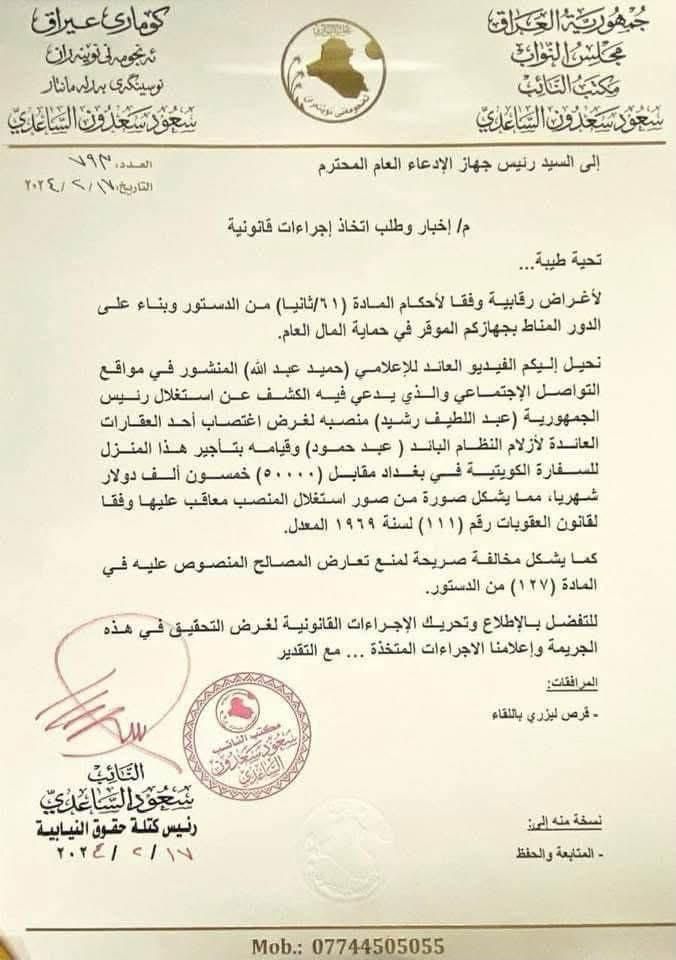 العراقي سعود سعدون الساعدي، بطلب رسمي للتحقيق مع رئيس الجمهورية بتهمة استغلال