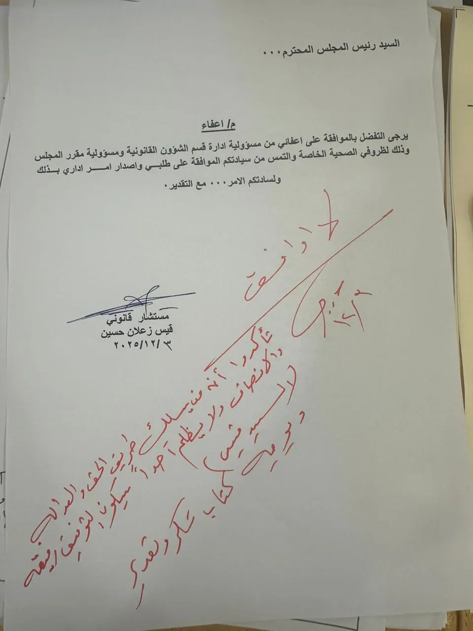 كشفت وثيقة رسمية، اليوم الأربعاء، عن تقديم مقرر مجلس محافظة ديالى ورئيس قسم الشؤون القانونية في المجلس قيس زعلان، طلب استقالة من منصبه إلا أن رئيس المجلس عمر الكروي قد رفضه وحثه على الاستمرار في أداء مهام عمله.
