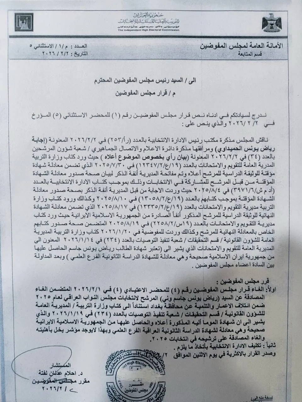 وفي وقت سابق من اليوم أظهرت وثيقة رسمية صادرة عن مجلس المفوضين أن الأخير صادق على إلغاء المصادقة على ترشيح رياض يونس جاسم لانتخابات مجلس النواب العراقي، وذلك بعد التأكد من عدم صحة وثيقة التخرج التي قُدِّمت أثناء استقبال قوائم المرشحين لعام 2025، ومخالفتها شروط الترشيح، استناداً إلى كتب رسمية صادرة من وزارة التربية والجهات القانونية المختصة.