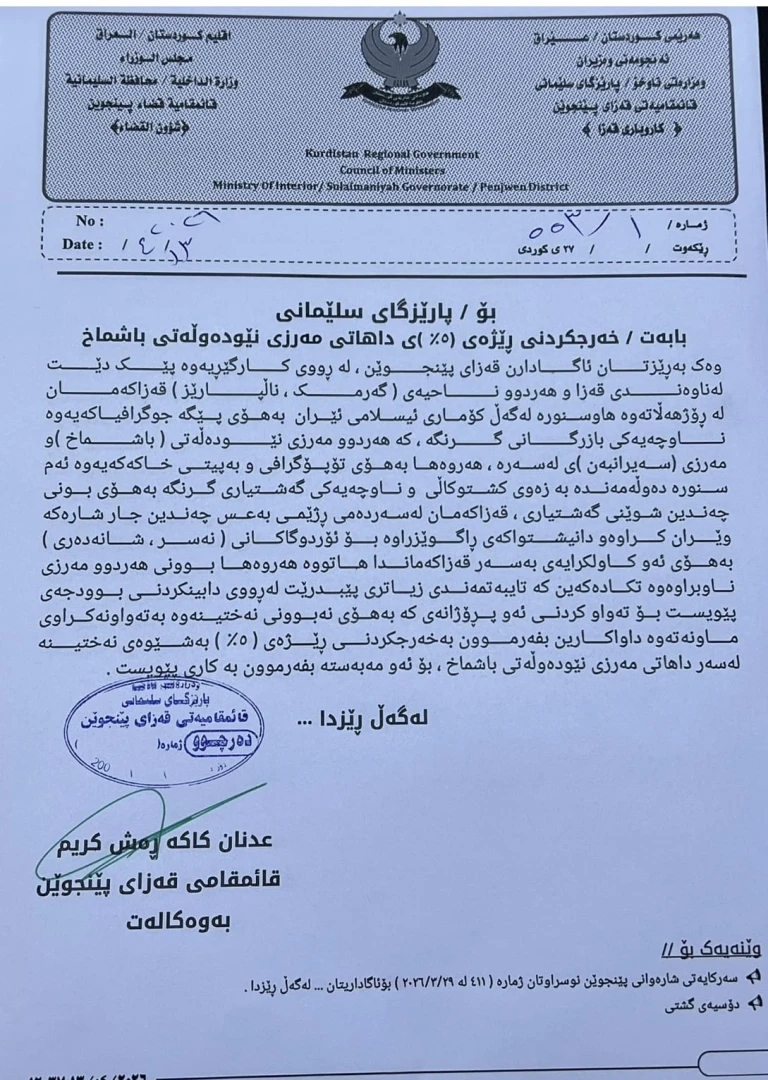 وجاء في كتاب رسمي صادر عن قائممقام بنجوين بالوكالة، عدنان كاكهرش، اطلعت عليه وكالة شفق نيوز، أنه تم توجيه الطلب إلى حكومة محافظة السليمانية، مع التأكيد على ضرورة إيلاء اهتمام أكبر للقضاء من ناحية توفير الميزانية اللازمة.