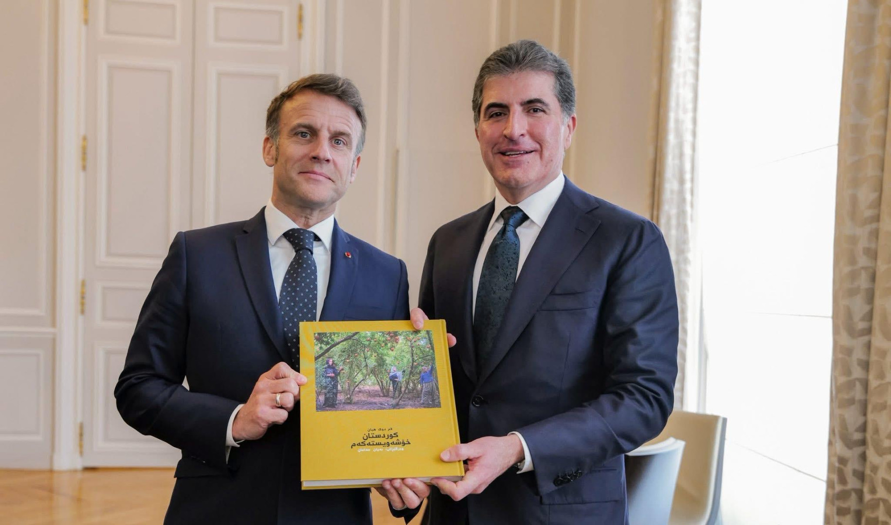 وعقب اللقاء، أهدى نيجيرفان بارزاني، كتاب "كوردستان حبيبتي" إلى الرئيس الفرنسي، إيمانويل ماكرون.