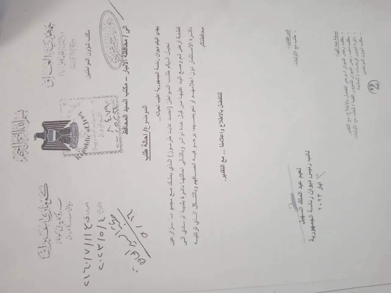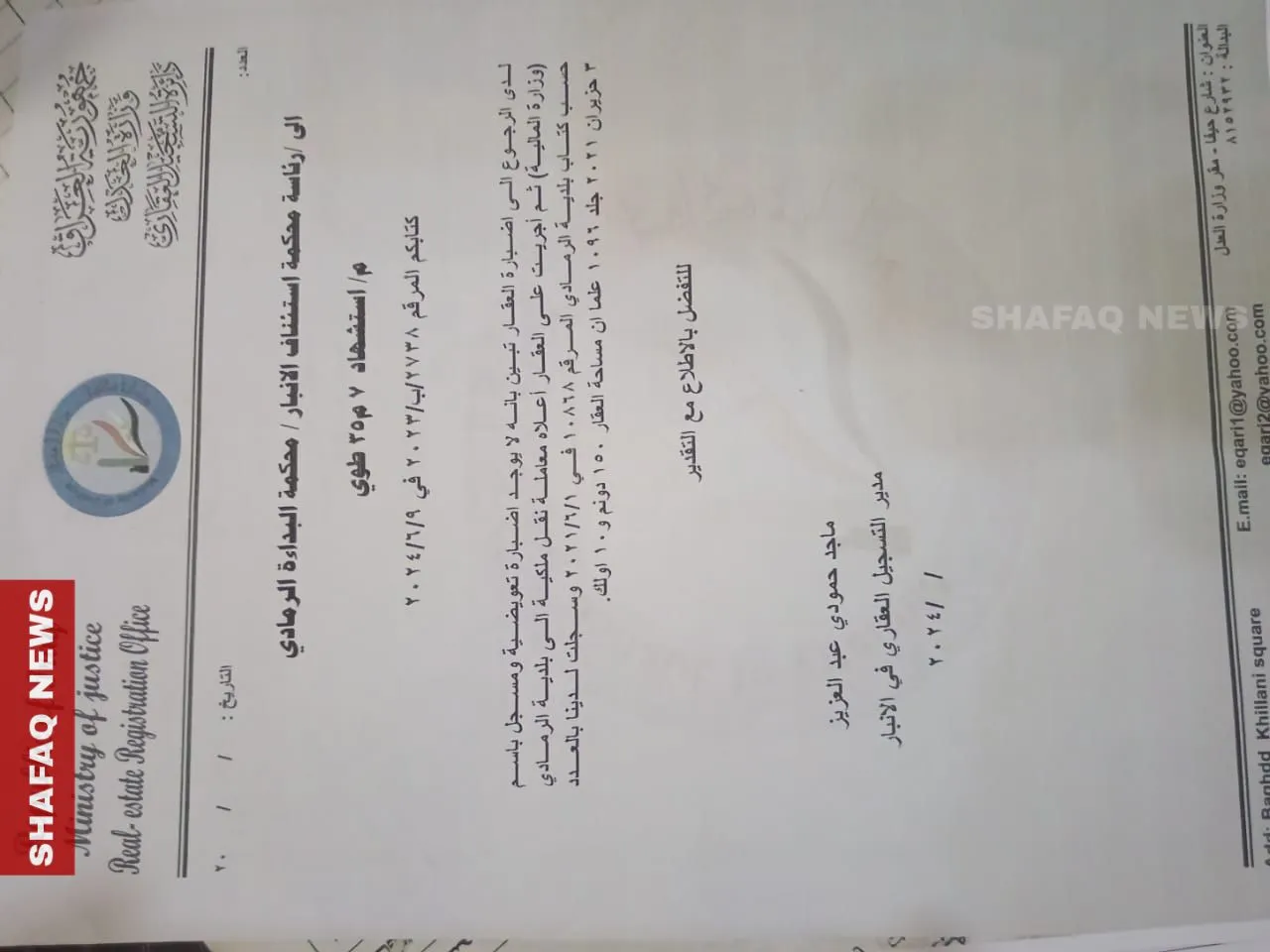 وتشهد محافظة الأنبار منذ سنوات نزاعات متكررة حول ملكية الأراضي الزراعية والسكنية، خصوصاً تلك الواقعة في المناطق الغربية مثل الرمادي وهيت وحديثة والرطبة، حيث تتقاطع مصالح المستثمرين مع مطالب الأهالي الذين يؤكدون امتلاكهم وثائق ملكية تعود لعقودٍ طويلة.
