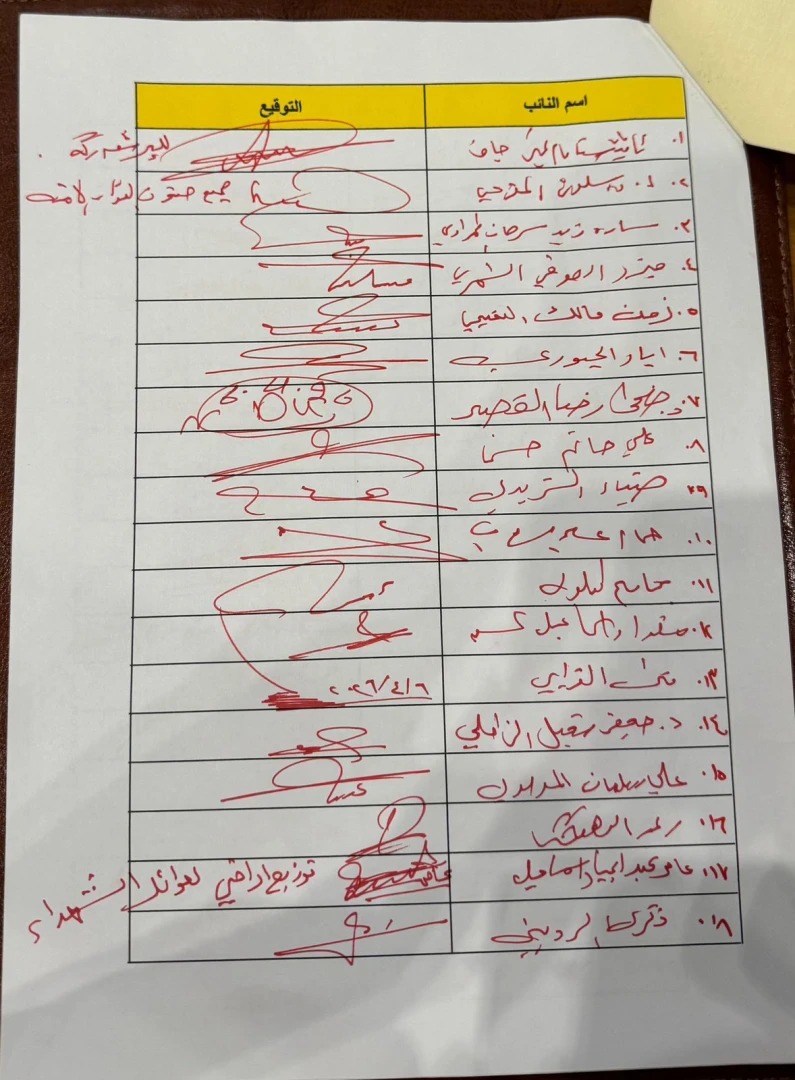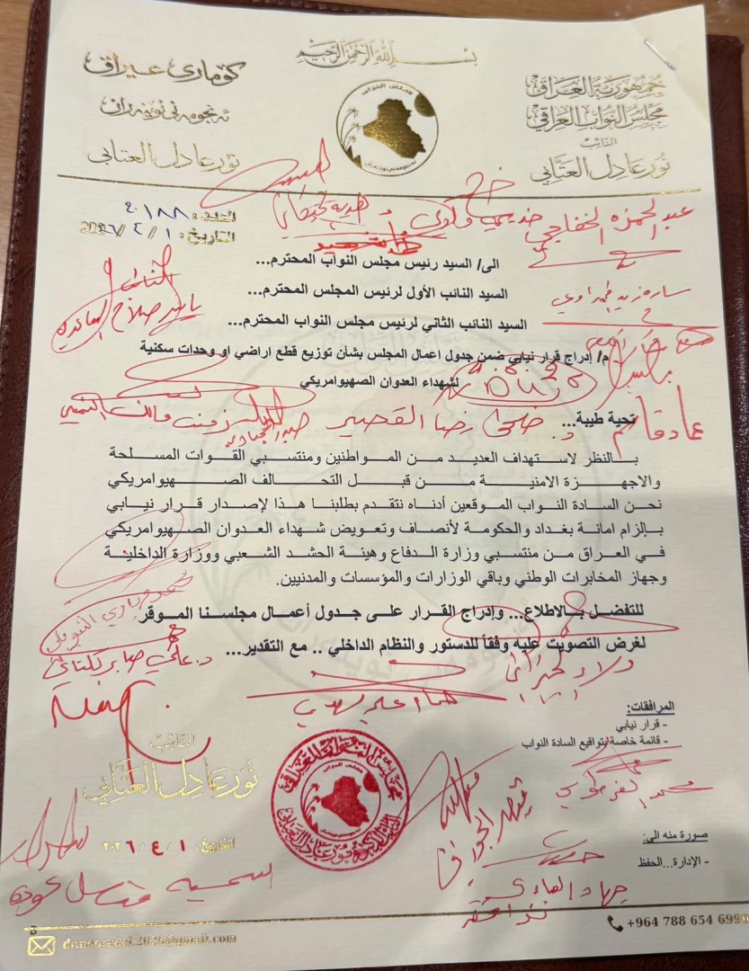 وبحسب وثيقة مرفقة، فإن الطلب المقدم إلى رئاسة مجلس النواب تضمن إدراج القرار ضمن جدول الأعمال للتصويت عليه، بهدف إلزام الجهات المعنية بتعويض ذوي الضحايا وتخصيص قطع أراضٍ سكنية لهم.