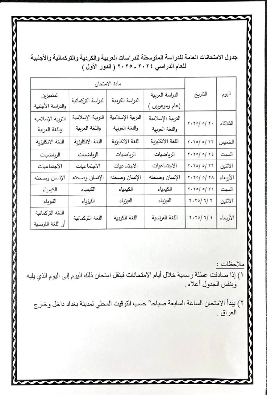 التربية العراقية تنشر جدول امتحانات الدور الأول للسادس الابتدائي والثالث المتوسط (وثيقة)