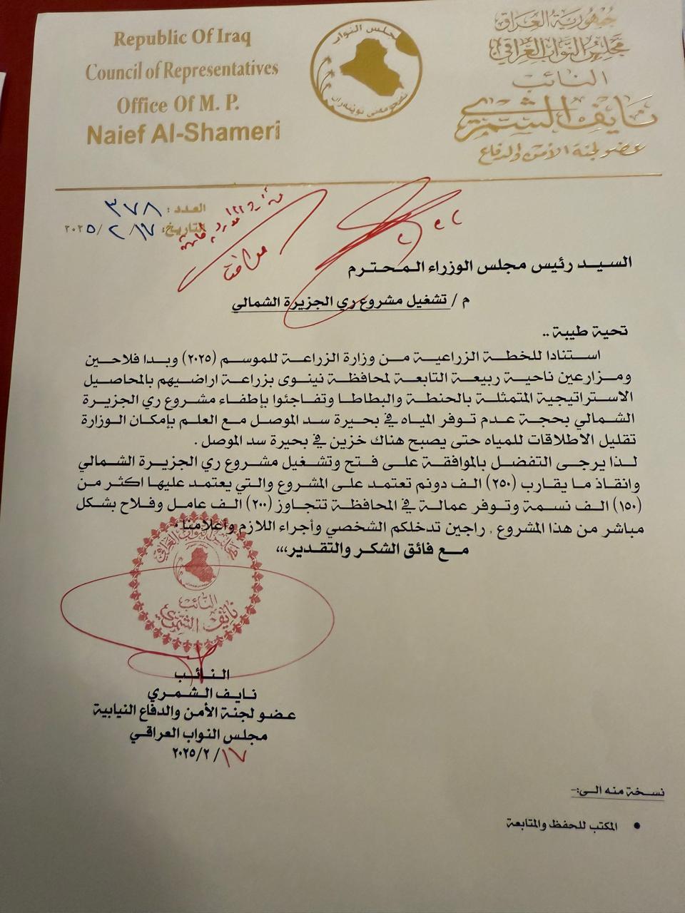 شفق نيوز/ أعلن النائب عن محافظة نينوى نايف الشمري، يوم السبت، استحصال موافقة رسمية من رئيس الوزراء محمد شياع السوداني، على تشغيل مشروع ري الجزيرة الشمالي.