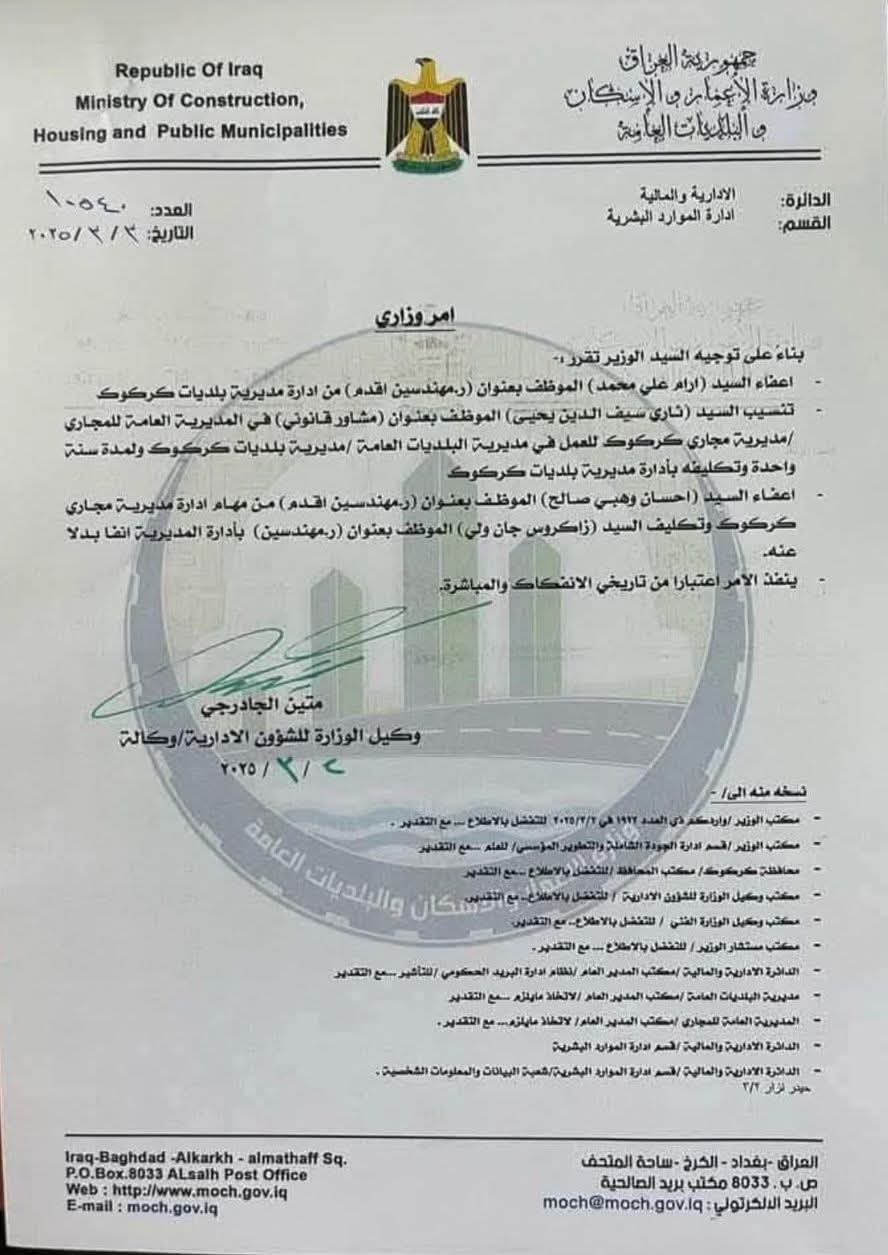 إعفاء مديري بلديات ومجاري كركوك وتكليف بديلين عنهما (وثيقة)