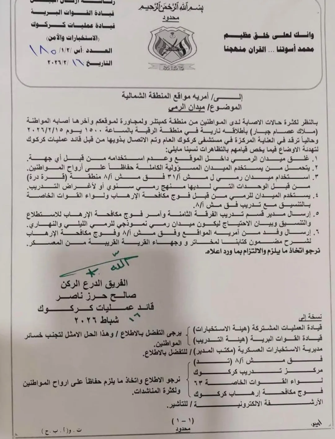 وفي تطور لاحق، أفاد مصدر أمني، بأن توجيهاً صدر من قائد عمليات كركوك الفريق الركن صالح حرز يقضي بإغلاق جميع ميادين الرمي داخل معسكر K1 القريبة من المناطق السكنية، حفاظاً على أرواح المواطنين.