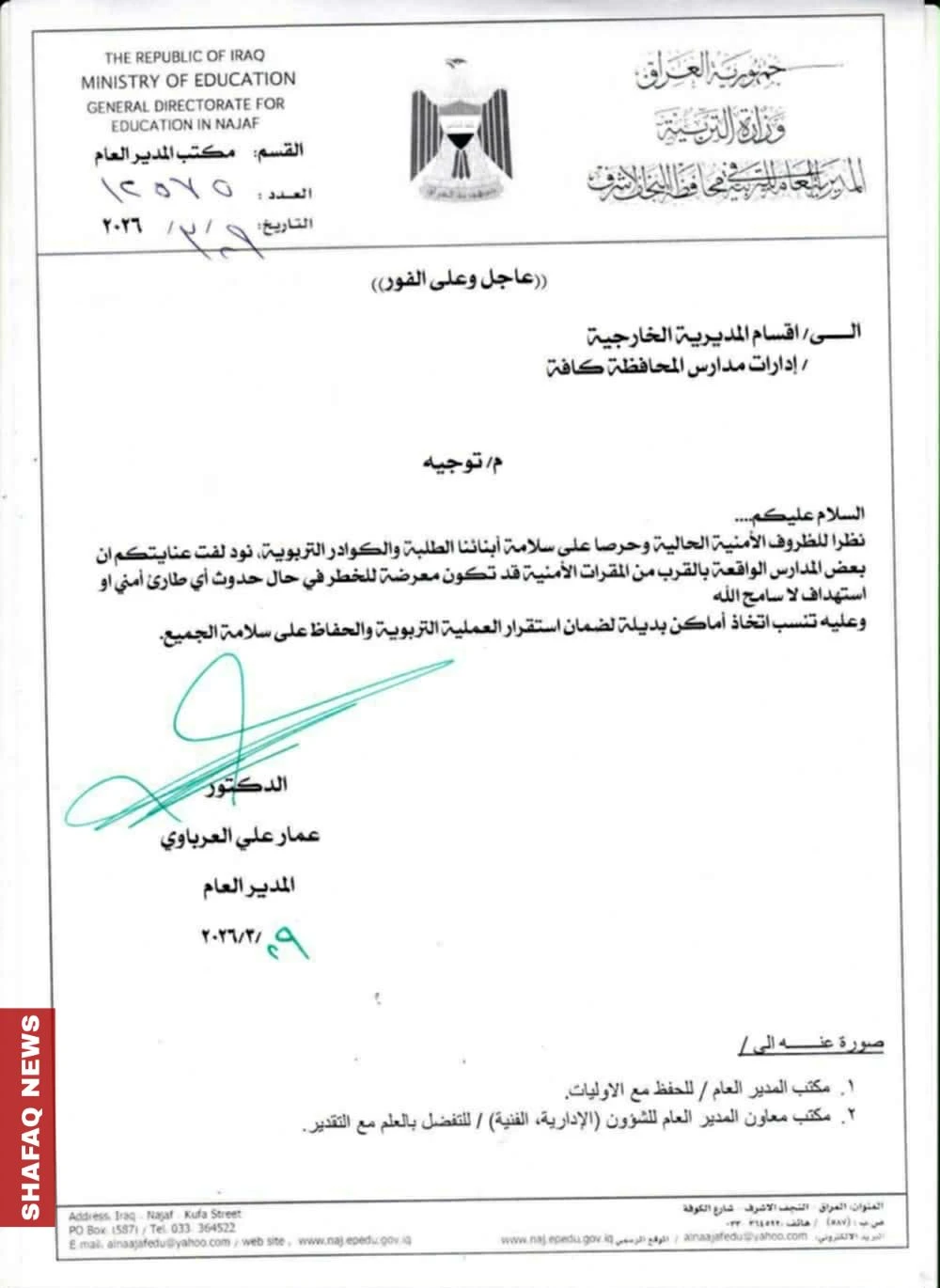وحصلت وكالة شفق نيوز على وثيقة صادرة من مديرية التربية، نصت على أنه "نظرا للظروف الأمنية الحالية وحرصا على سلامة أبنائنا الطلبة والكوادر التربوية، نود لفت عنايتكم ان بعض المدارس الواقعة بالقرب من المقرات الأمنية قد تكون معرضة للخطر في حال حدوث أي طارئ أمني او استهداف، وعليه تنسب اتخاذ أماكن بديلة لضمان استقرار العملية التربوية والحفاظ على سلامة الجميع".