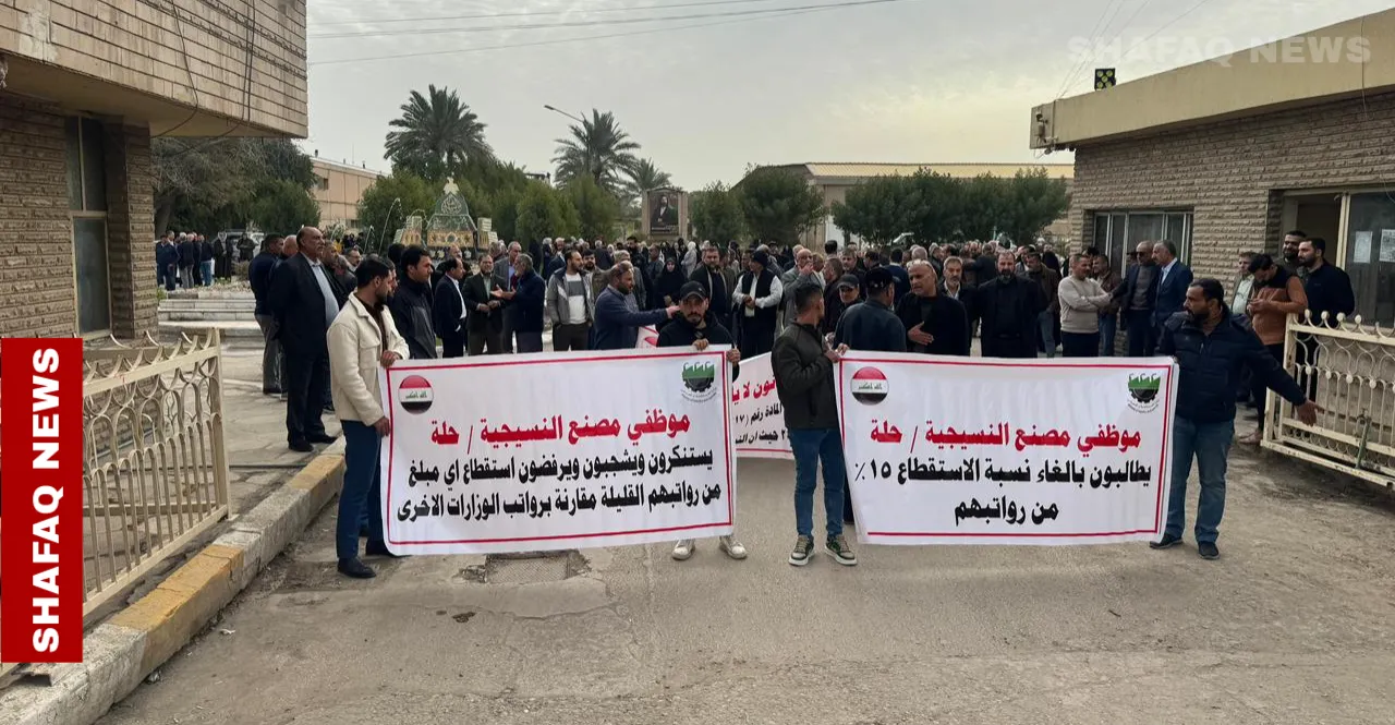 وفي بابل، نظم عدد من موظفي معمل نسيج الحلة التابع لوزارة الصناعة والمعادن، تظاهرة سلمية أمام بوابة المعمل، احتجاجًا على استقطاع نسبة 15% من رواتبهم تحت عنوان التوقيفات التقاعدية، مؤكدين أن هذا الإجراء زاد من أعبائهم المعيشية في ظل رواتب متدنية.