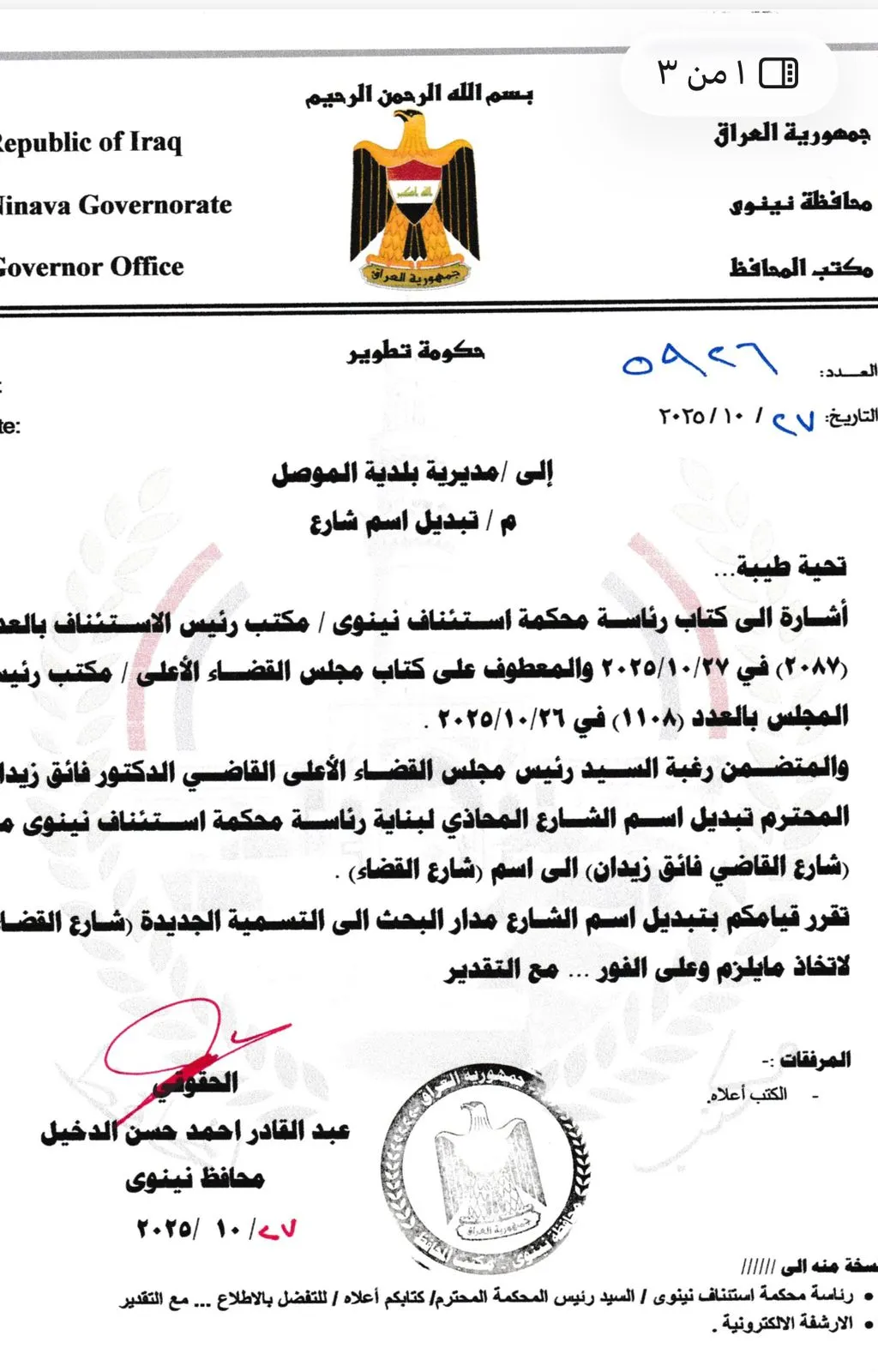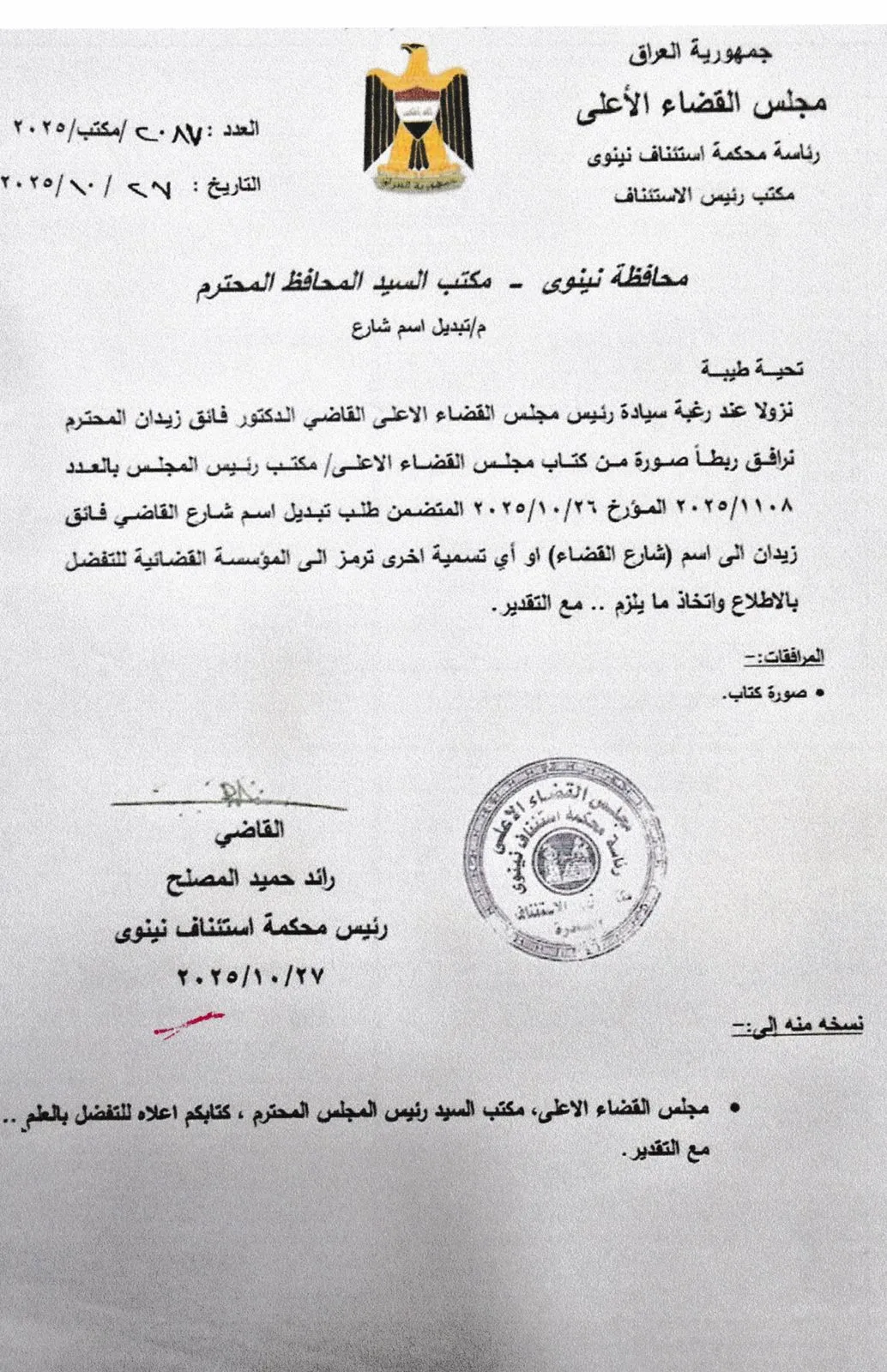 وبينت الوثائق أن محافظة نينوى باشرت بإجراءات تنفيذ الطلب وتعديل الاسم رسمياً في السجلات البلدية إلى "شارع القضاء"، التزاماً بتوجيه رئيس مجلس القضاء الأعلى.