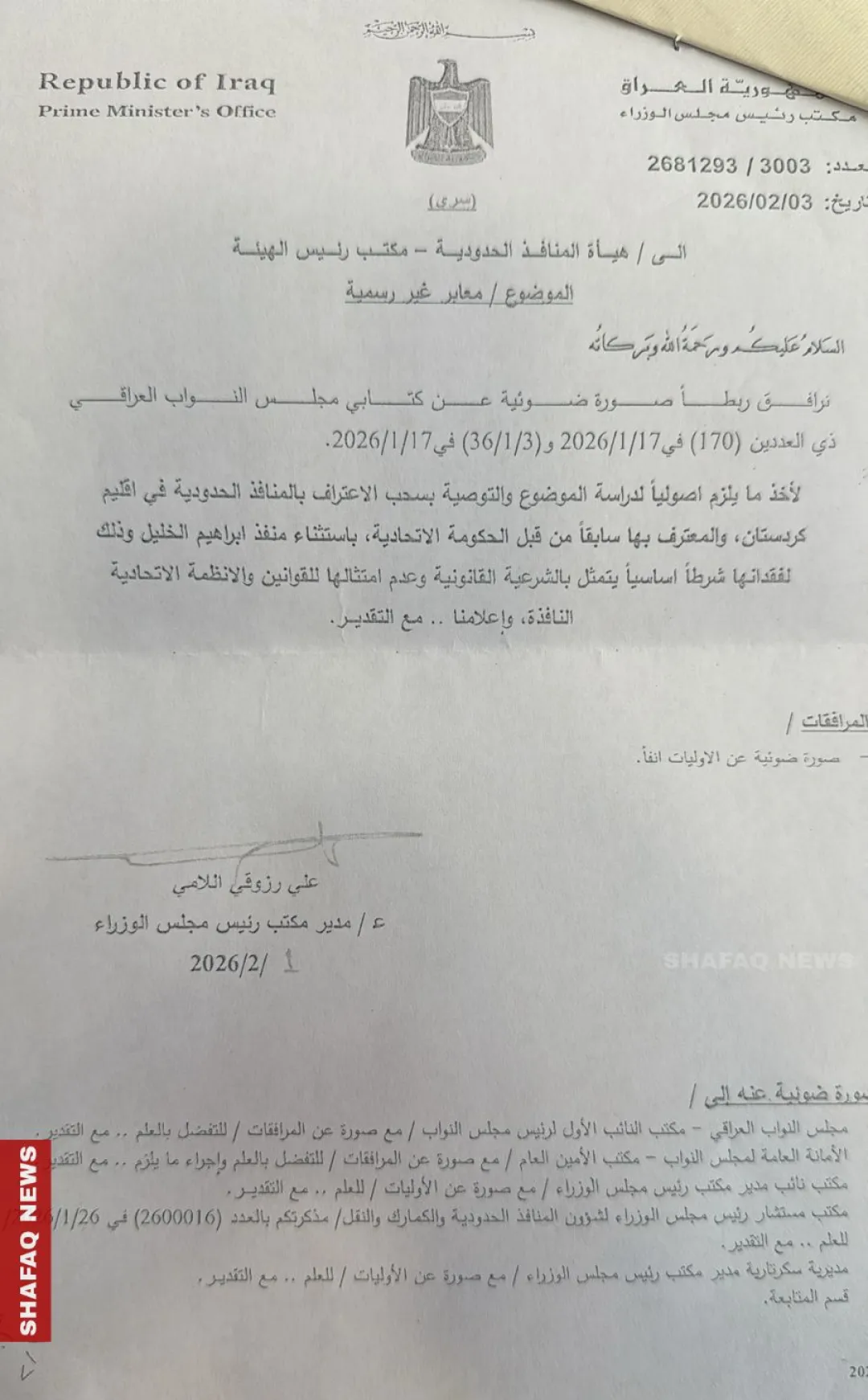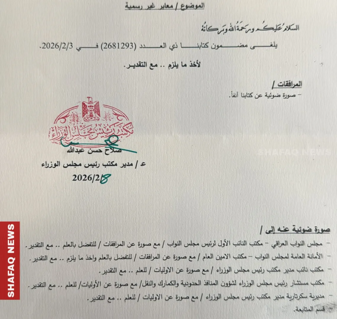 وأضاف: "أنني فرحت كثيرا ان مكتب رئيس مجلس الوزراء أصدر كتاب رسمي إلى هيئة المنافذ الحدودية، أمر فيه بسحب بمحاسبة القائمين والمسؤولين عن المنافذ في تاريخ 2026/2/3 ولكن المؤلم بتاريخ 2026/2/8 صدر كتاب جديد من مكتب رئيس الوزراء يقضي بإلغاء الكتاب السابق".