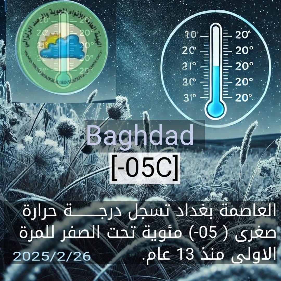 الأربعاء، سجلت بغداد 05 - درجة مئوية تحت الصفر".