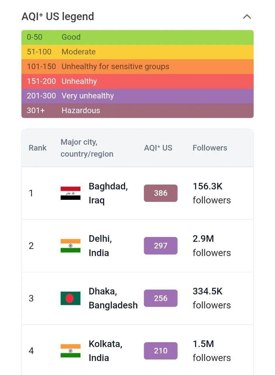 وبحسب المؤشر العالمي لجودة الهواء، فقد "سجلت بغداد مستوى غير مسبوق من التلوث الجوي، إذ حلت للمرة الأولى في المرتبة الأولى عالميا، متجاوزة مدنا معروفة بارتفاع نسب التلوث، حيث جاءت العاصمة الهندية نيودلهي في المرتبة الثانية، تلتها العاصمة البنغلاديشية دكا في المركز الثالث.