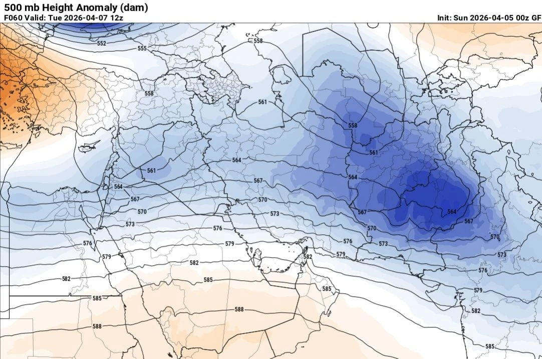أظهرت خرائط الطقس، يوم الأحد، تأثر البلاد بحالة من عدم الاستقرار الجوي خلال الفترة الممتدة من 7 لغاية 9 من شهر نيسان الجاري، نتيجة تشكّل منخفض جوي "سطحي" مترافق مع امتداد أخدود علوي بارد في طبقات الجو العليا.