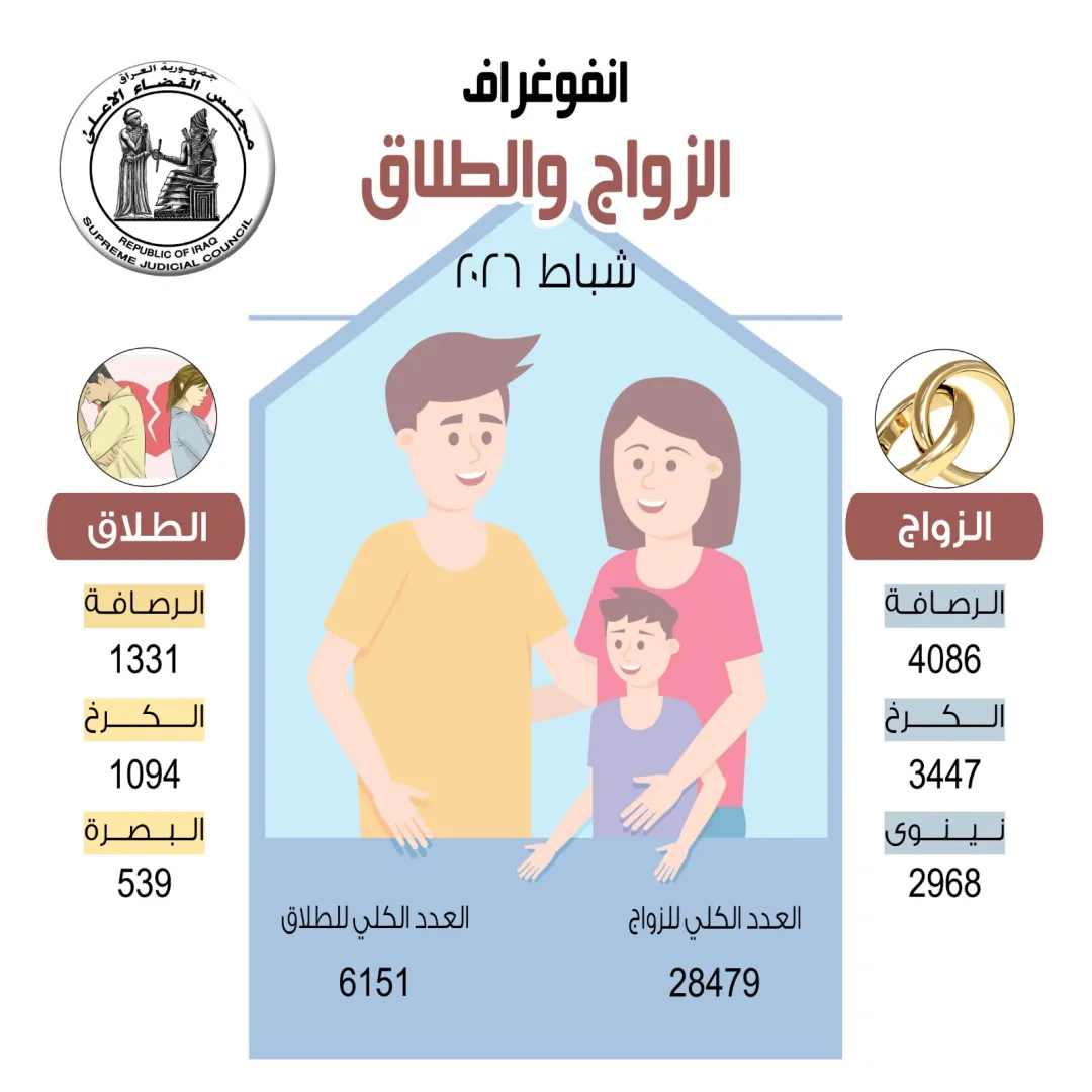 أعلن مجلس القضاء الأعلى، يوم الأحد، عن إحصائية رسمية لحالات الزواج والطلاق في محافظات العراق (باستثناء إقليم كوردستان) خلال شهر شباط/ فبراير الماضي، مشيراً إلى تسجيل نحو 30 ألف عقد زواج جديد.
