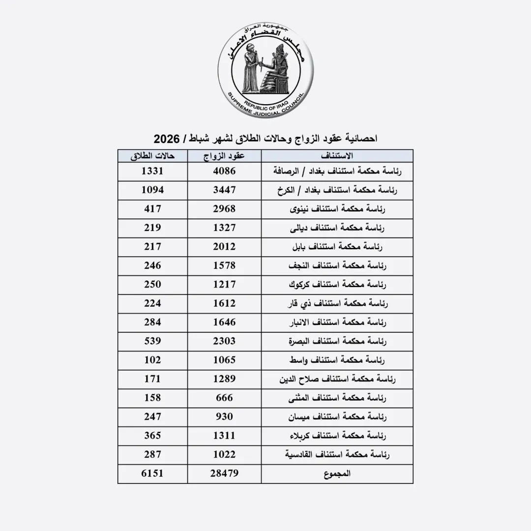 القضاء العراقي: تسجيل نحو 30 ألف حالة زواج و6 آلاف طلاق خلال شباط الماضي