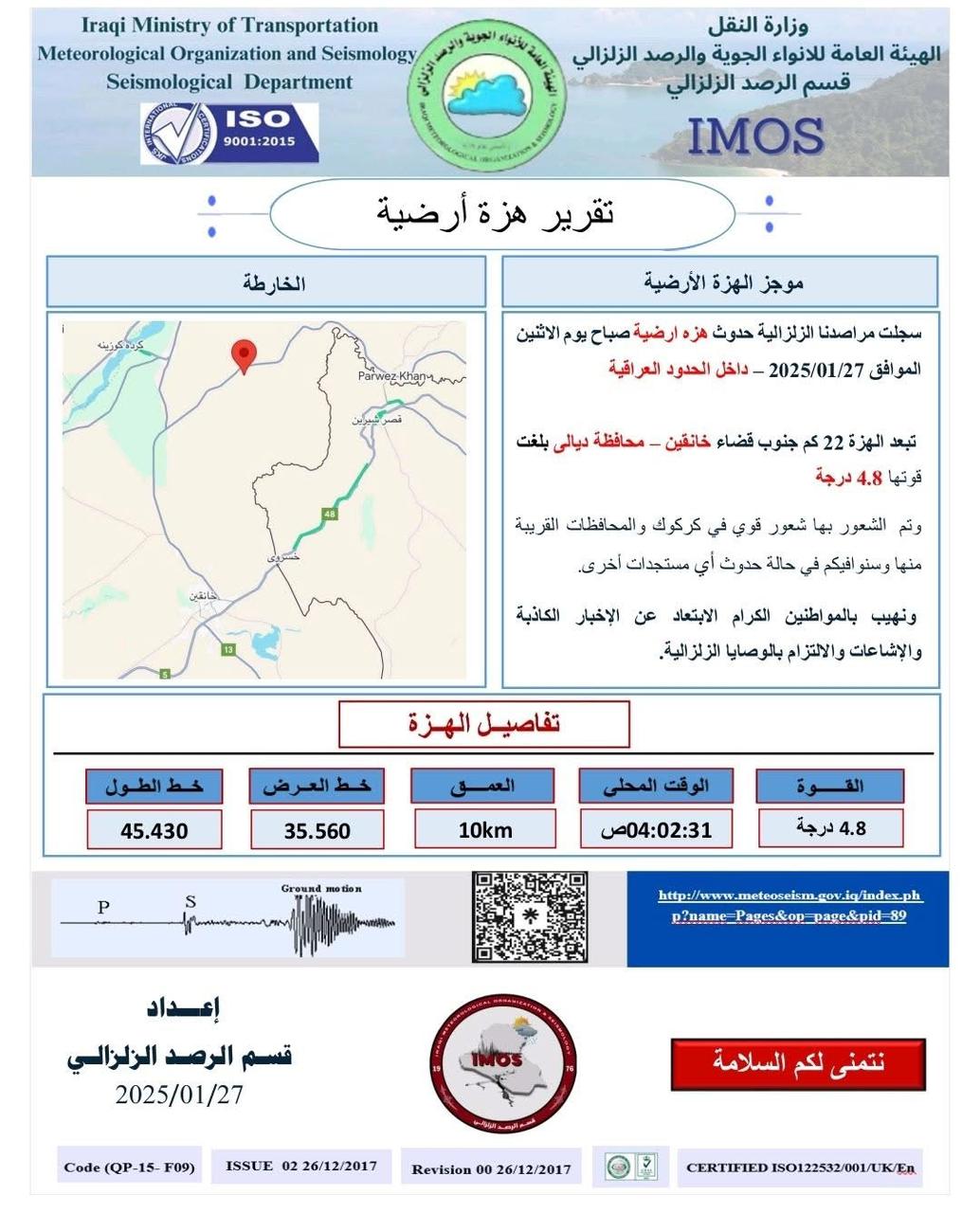 شفق نيوز/ أعلنت الهيئة الانواء الجوية والرصد الزلزالي العراقية، أن هزة أرضية بقوة 4.8 درجات ضربت محافظة ديالى قرب الحدود الإيرانية.