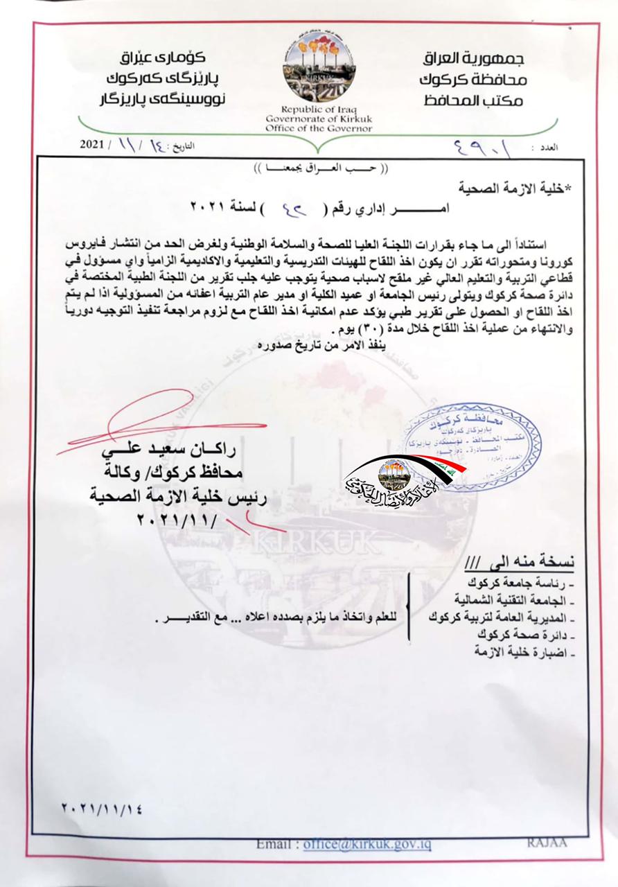 وجاء في وثيقة حصلت عليها وكالة شفق نيوز، مذيلة باسم محافظ كركوك راكان الجبوري، أنه "استنادا الى ما جاء بقرارات اللجنة العليا للصحة والسلامة الوطنية ولغرض الحد من انتشار فيروس کورونا ومتحوراته تقرر أن يكون أخذ اللقاح للهيئات التدريسية والتعليمية والأكاديمية الزامياً واي مسؤول في قطاعي التربية والتعليم العالي غير ملقح لأسباب صحية يتوجب عليه جلب تقرير من اللجنة الطبية المختصة في دائرة صحة كركوك".