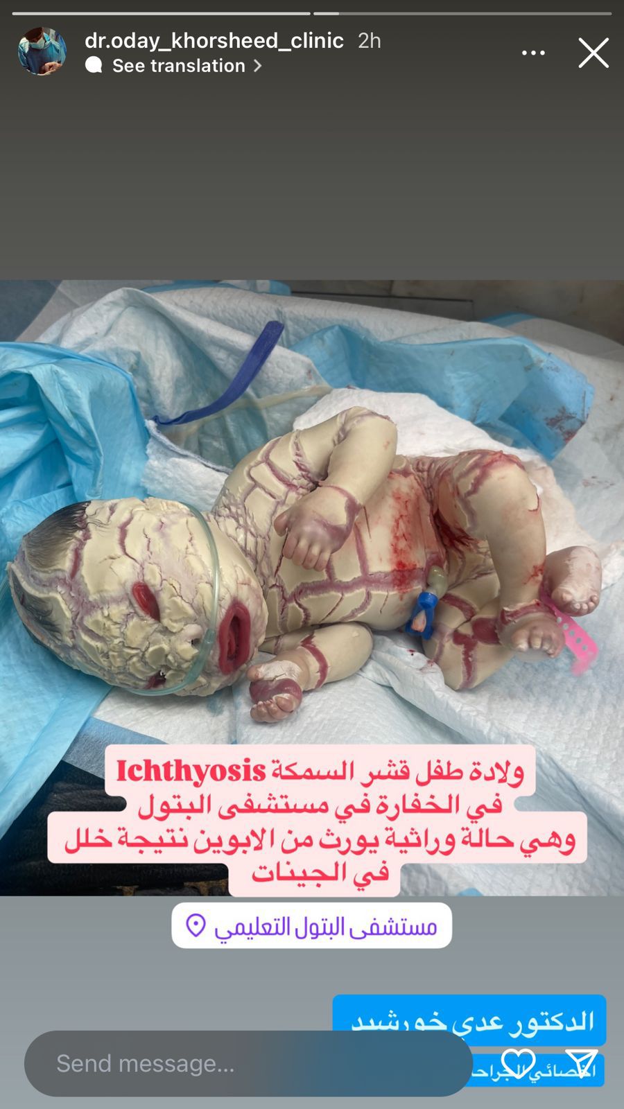 وذكر الطبيب الأخصائي في الولادة والنسائية والعقم، عدي خورشيد، في قصة نشرها عبر حسابه على موقع إنستغرام واطلعت عليها وكالة شفق نيوز، أن "محافظة ديالى شهدت ولادة طفل بقشر سمكة"، مشيراً إلى أن الحالة سُجلت داخل المستشفى المذكور.