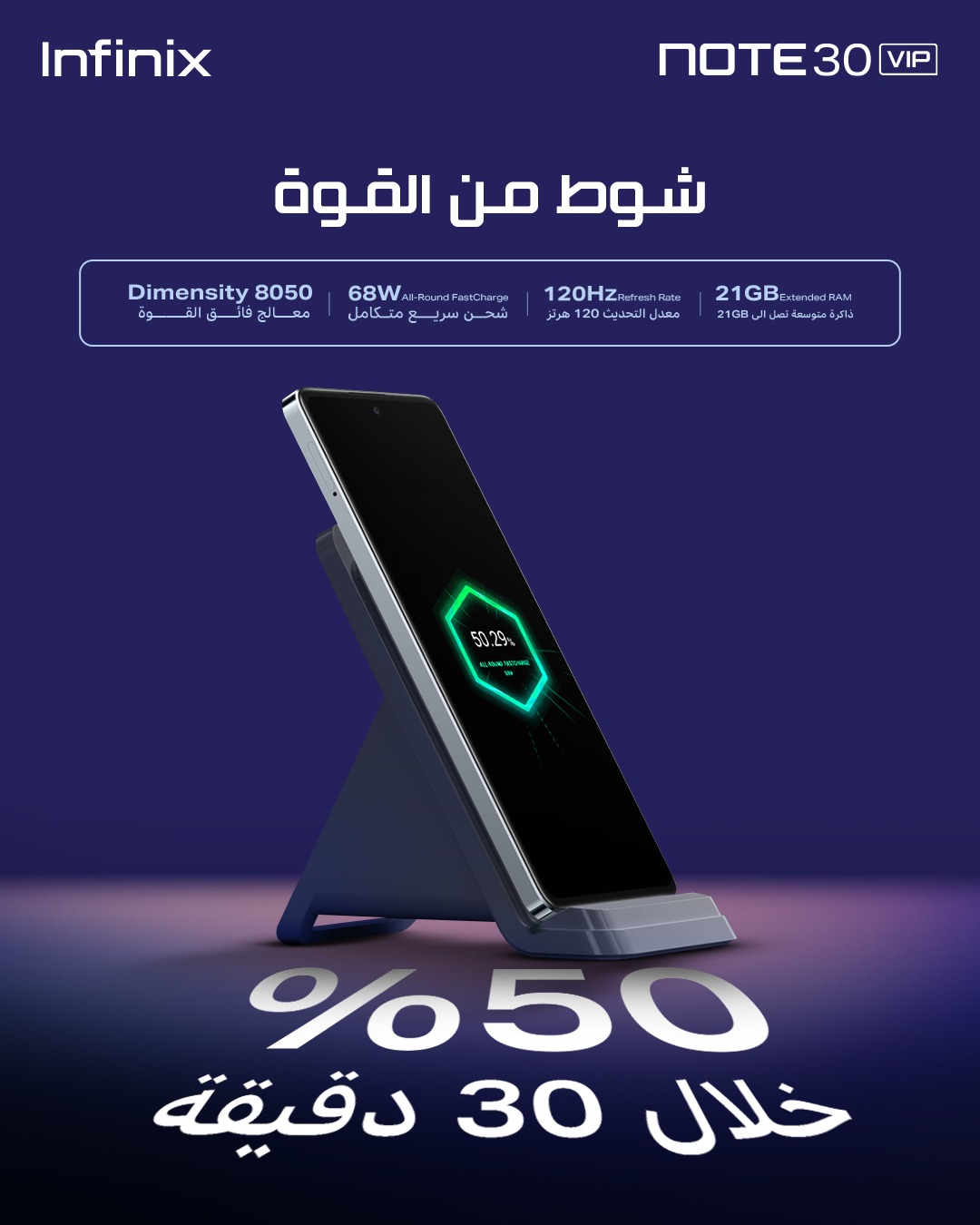 كذلك شهد هاتف Note 30 VIP ترقية اخرى من ناحية تقنيات الشحن السريع اللاسلك مصمم لتلبية احتياجات الشباب المتنامية في الوقت الحالي. يقدم هاتف نوت 30 VIP تقنية الشحن السريع المتكاملة مع شحن سلكي بقدرة 68 واط وشاحن لاسلكي قدرة 50 واط مرفق في العلبة يتيح ملىء بطارية الجهاز الى 50% في غضون 30 دقيقة فقط، مما يوفر شحنًا عالي السرعة سواءً بالأسلاك أو بدونها لتغذية بطارية سعة 5000mAh