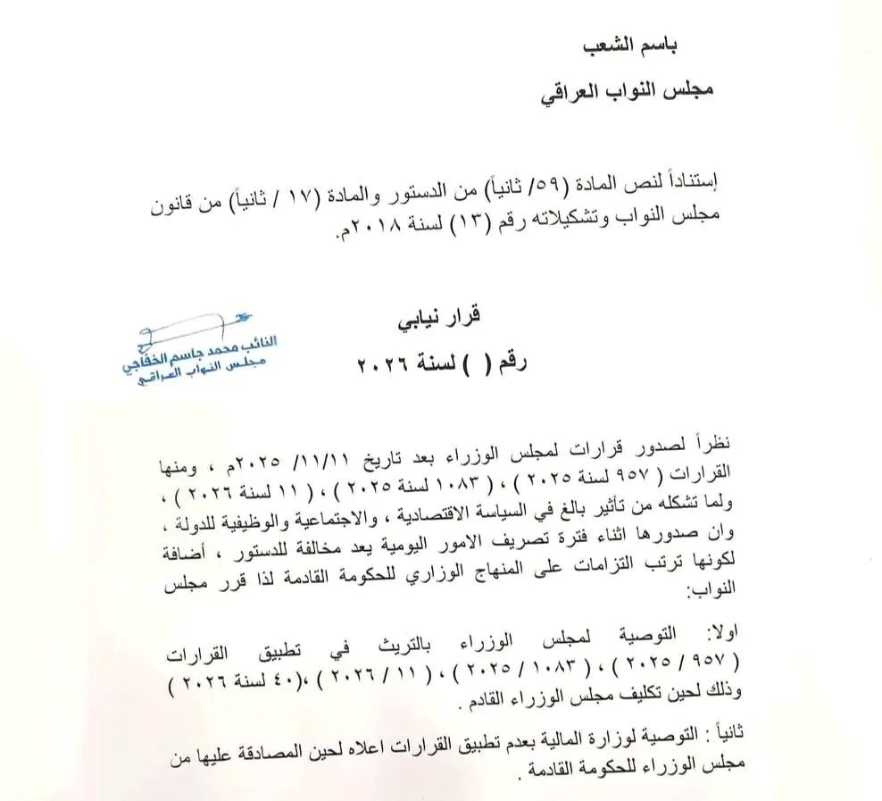 وتنشر وكالة شفق نيوز، أدناه مسودة القرار التي كان من المقرر أن يصوت عليها مجلس النواب اليوم لتأجيل تطبيق قرارات المجلس الوزاري الاقتصادي، ومنها إلغاء مخصصات الخدمة الجامعية.