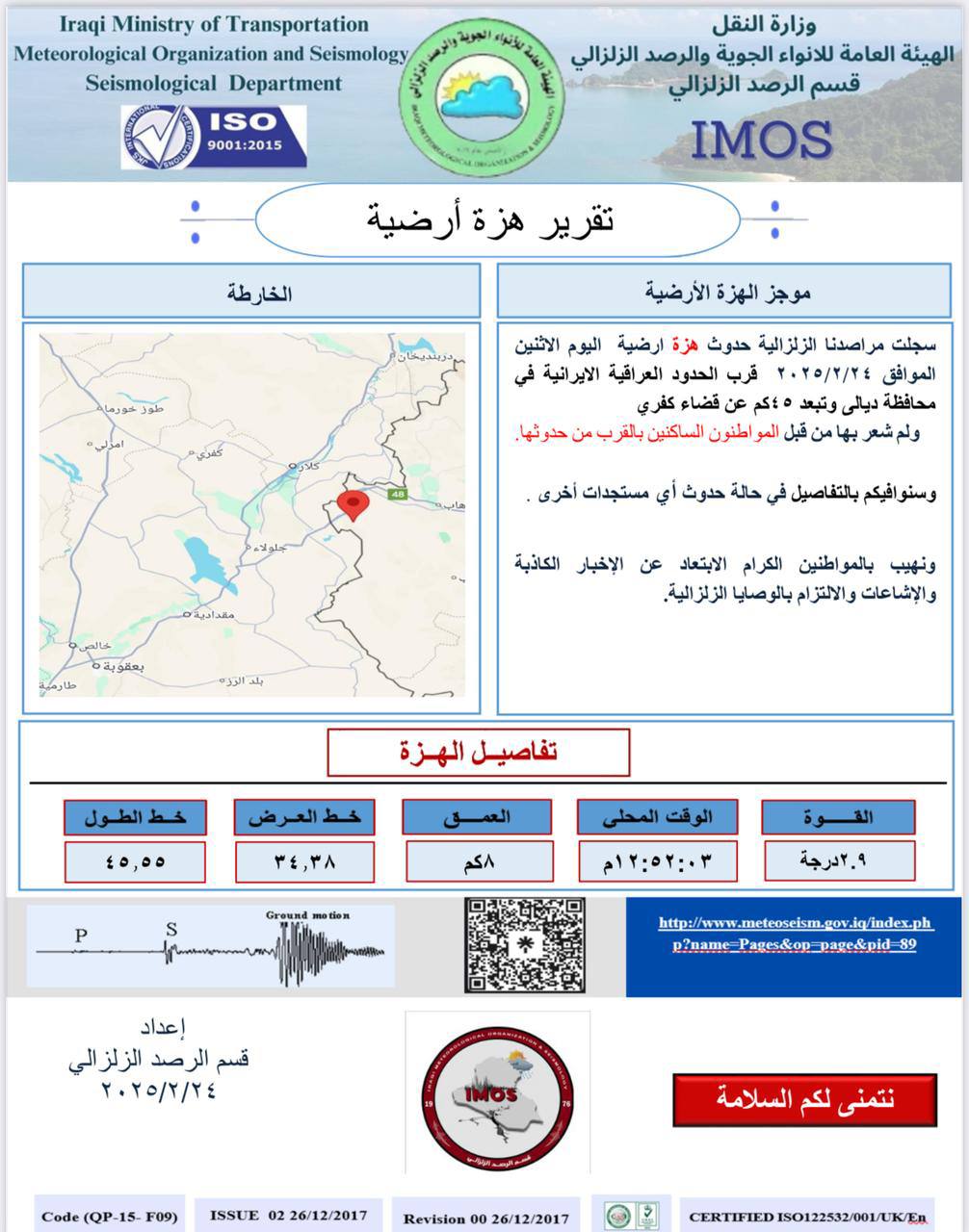 وبين تقرير صدر عن الهيئة العامة للانواء الجوية، ورد الى وكالة شفق نيوز، ان الهزة حدثت اليوم الاثنين الساعة 12:52:03 مساءً، ولم يشعر بها المواطنين.