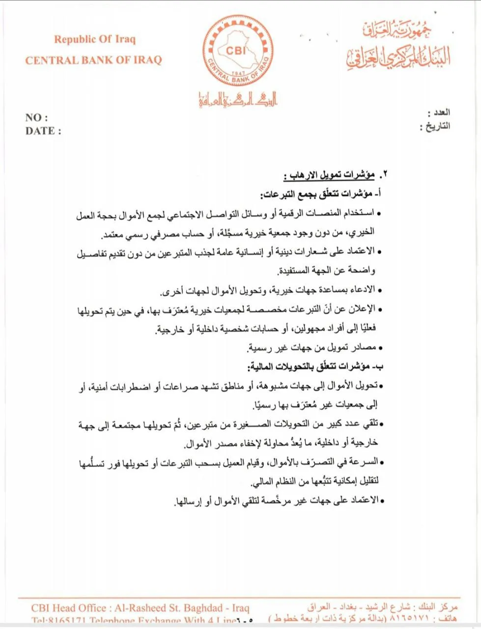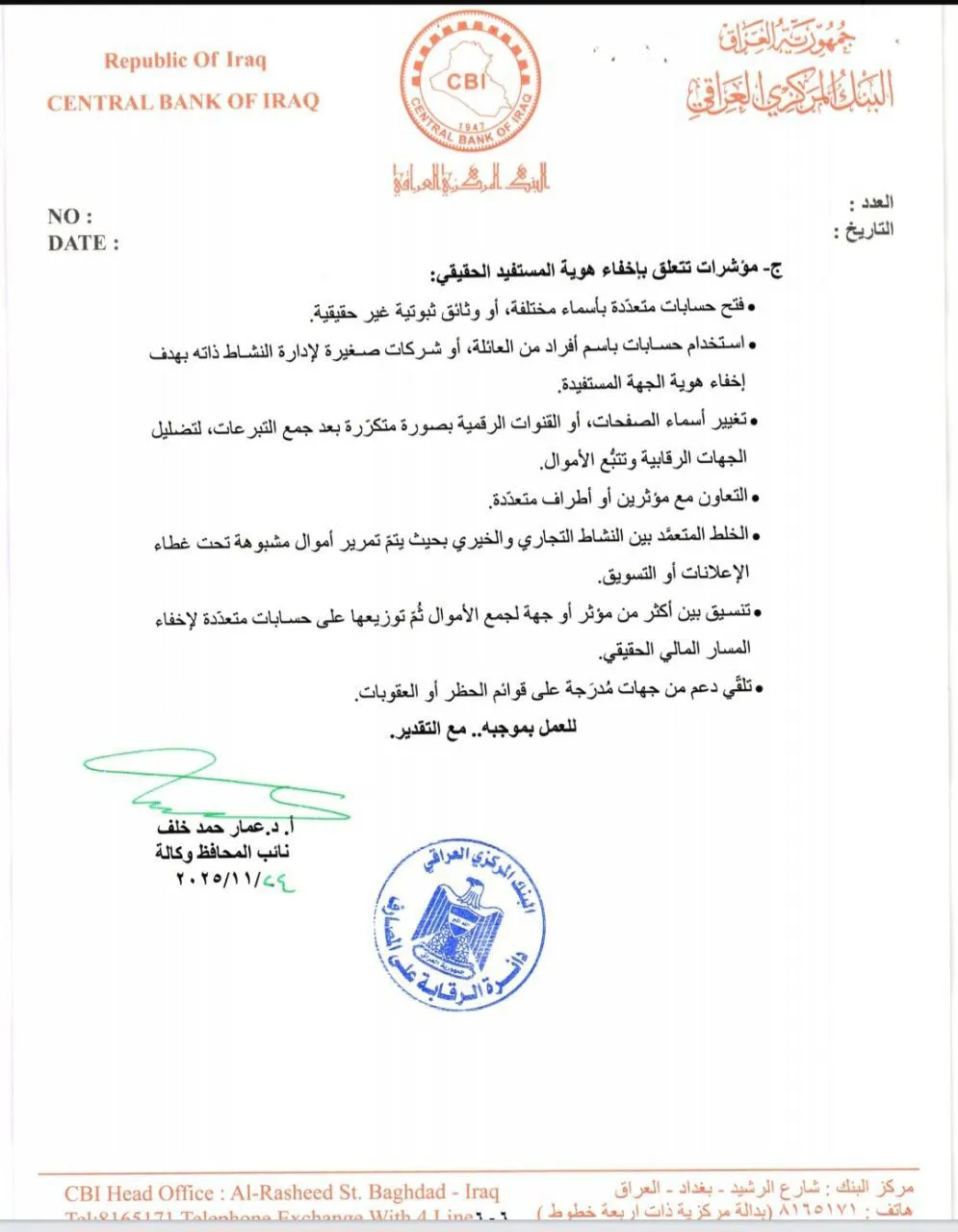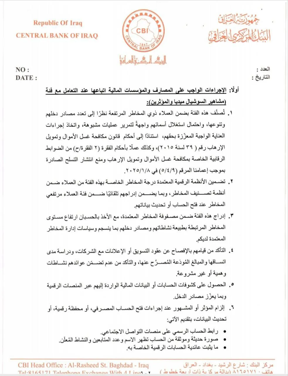 The Central Bank of Iraq (CBI) instructed all banks and financial institutions to classify social media celebrities and influencers as “high-risk and multi-risk clients.”