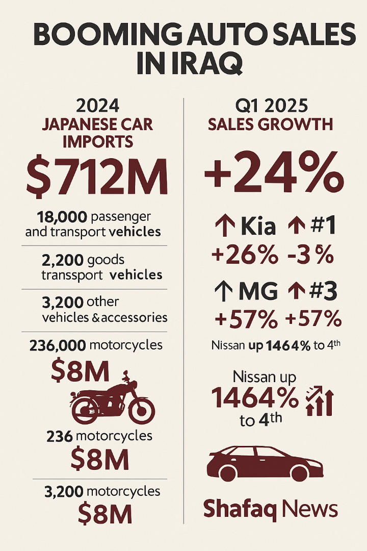 Shafaq News / Iraq’s imports of Japanese vehicles exceeded $700 million in 2024, according to official trade data.
