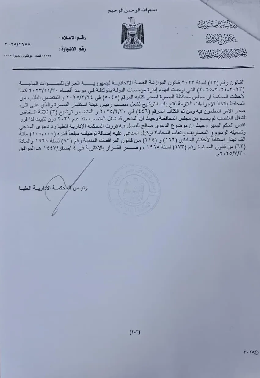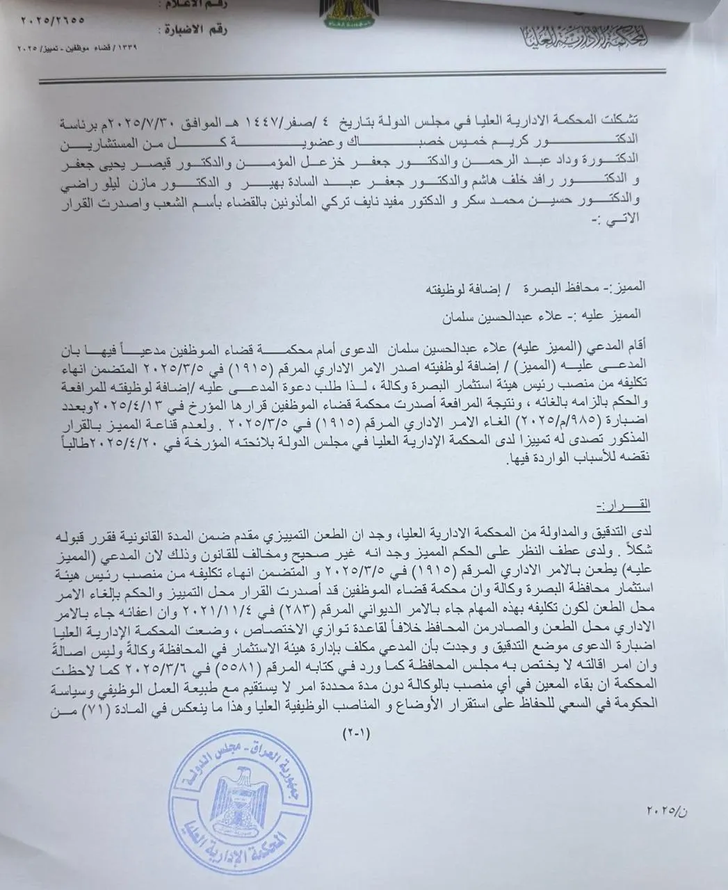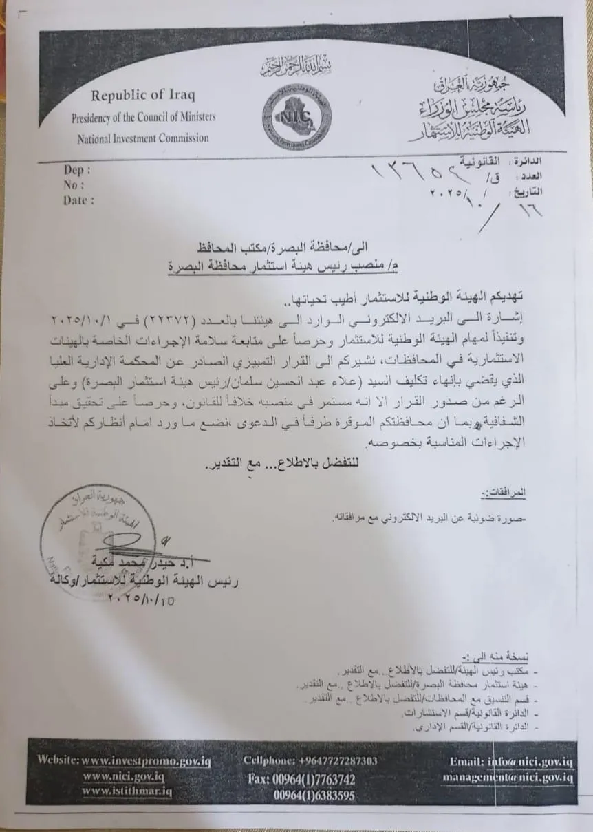The source told Shafaq News that the National Investment Commission had also formally requested Salman’s removal in a letter sent to the Basra province, citing the court ruling.