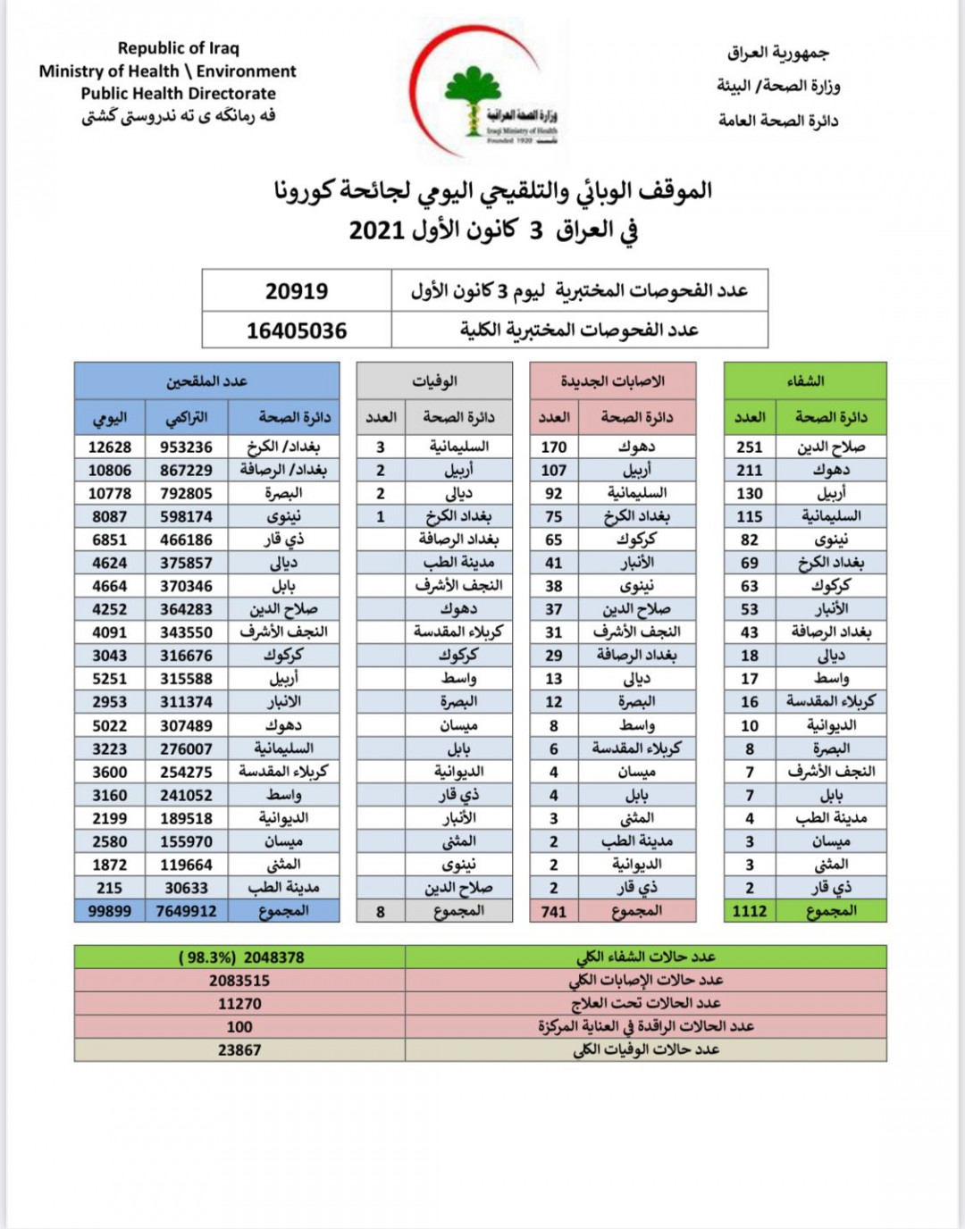 Since the outbreak of the COVID-19 in Iraq, 2,083,518 patients have contracted the virus, 2,048,378 of whom recovered (at a recovery rate of 98.3%), and 23,867 passed away.