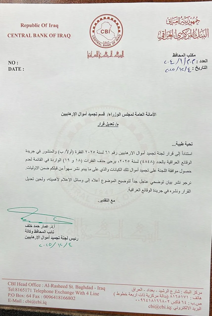 A supporting document from the office of the Central Bank governor—signed by Deputy Governor and committee chairman Ammar Hamad Khalaf and addressed to the Cabinet Secretariat’s Terrorist Funds Freezing Department—confirmed the error.