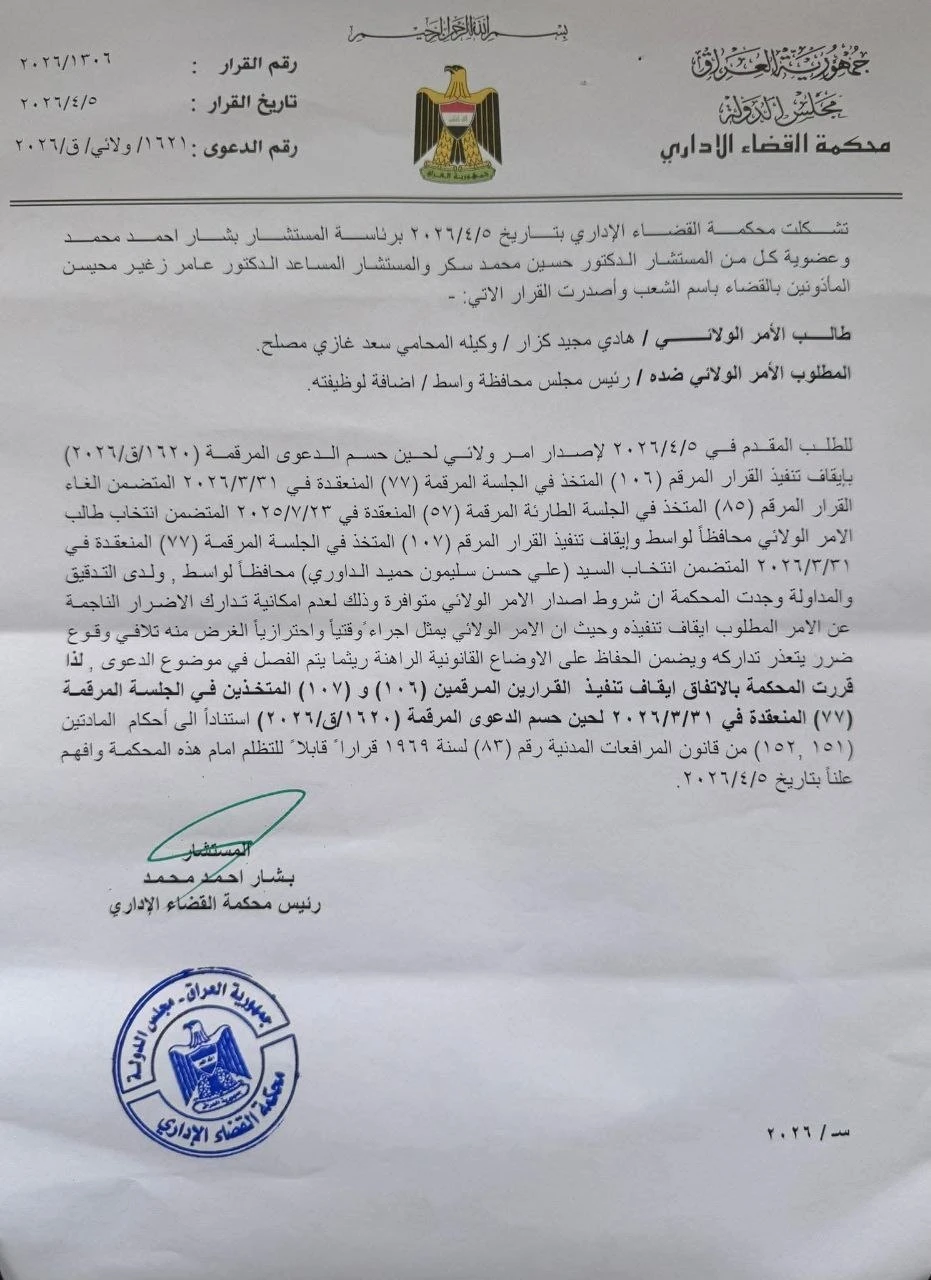 The Supreme Administrative Court invalidated resolutions issued during the Council’s 77th regular session (Nos. 106 and 107 of 2026), which had included the election of Ali Salim Hamid al-Zuhairi as the new governor of Wasit, deeming them “unlawful.”
